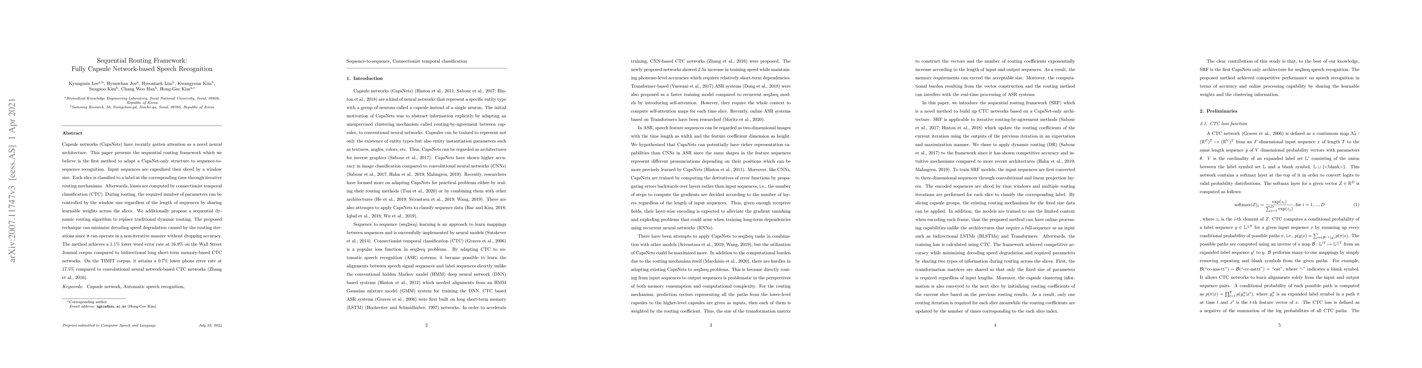 This paper introduces a sequential routing framework utilizing a fully CapsNet-only structure for sequence-to-sequence speech recognition, achieving a 1.1% lower word error rate on WSJ compared to LSTM-based CTC networks. The proposed method minimizes decoding speed degradation through a non-iterative dynamic routing algorithm.