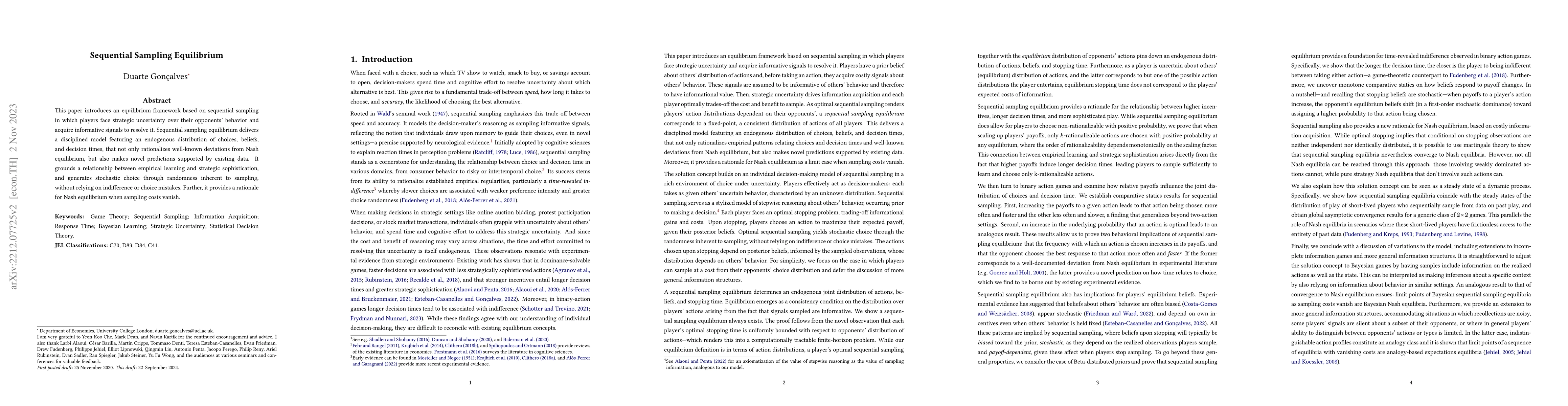 This paper proposes a sequential sampling equilibrium framework that resolves strategic uncertainty by acquiring informative signals, generating a disciplined model with endogenous distribution of choices and beliefs, and making novel predictions supported by empirical data. It links empirical learning to strategic sophistication and rationalizes deviations from Nash equilibrium without relying on indifference or mistakes.