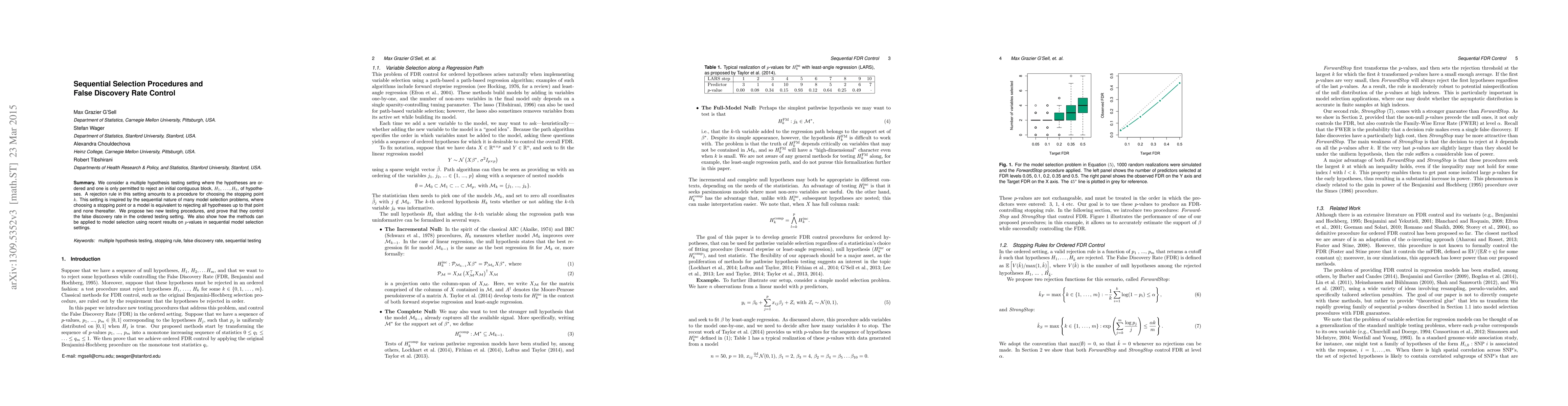We consider a multiple hypothesis testing setting where the hypotheses are ordered and one is only permitted to reject an initial contiguous block, H_1,\dots,H_k, of hypotheses. A rejection rule in this setting amounts to a procedure for choosing the stopping point k. This setting is inspired by the sequential nature of many model selection problems, where choosing a stopping point or a model is equivalent to rejecting all hypotheses up to that point and none thereafter. We propose two new testing procedures, and prove that they control the false discovery rate in the ordered testing setting. We also show how the methods can be applied to model selection using recent results on p-values in sequential model selection settings.
