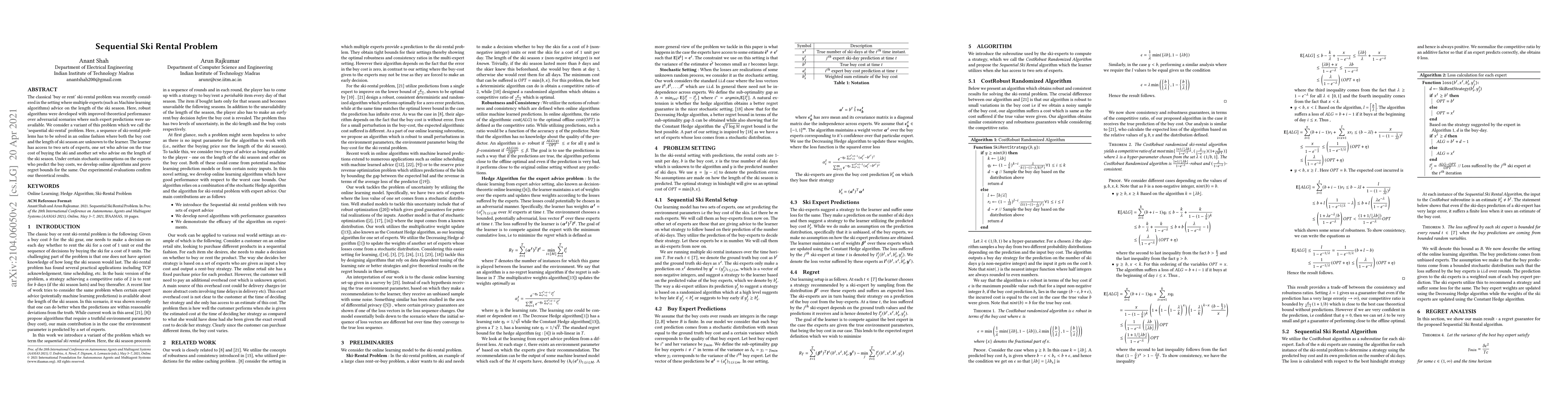 The paper develops robust online algorithms for a sequential ski-rental problem where buy and rental costs, along with ski season lengths, are unknown. It employs expert advice to achieve optimal performance under stochastic conditions, with theoretical regret bounds validated through experiments.