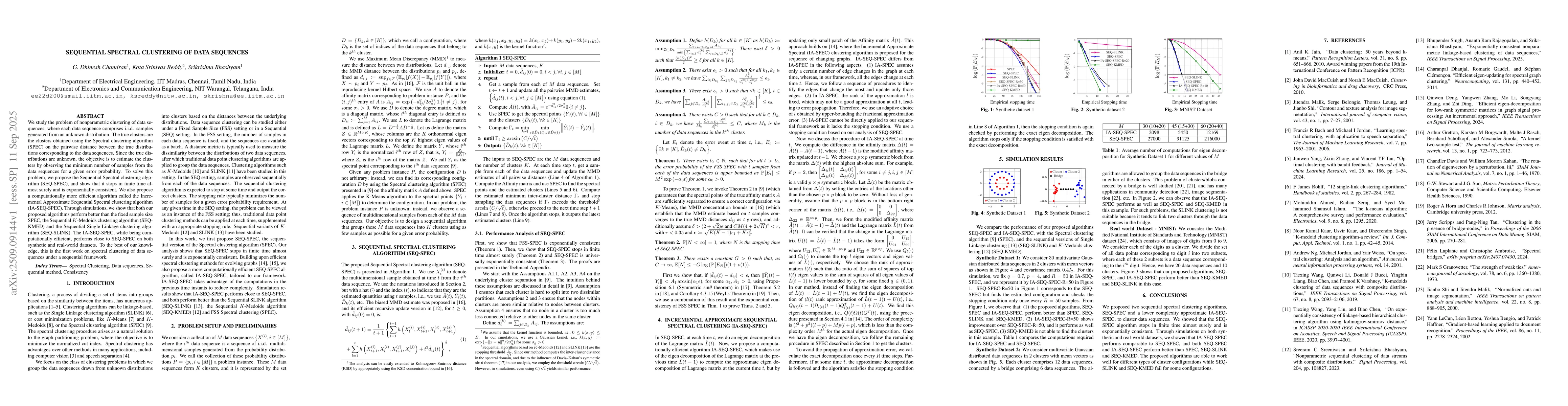 We study the problem of nonparametric clustering of data sequences, where each data sequence comprises i.i.d. samples generated from an unknown distribution. The true clusters are the clusters obtained using the Spectral clustering algorithm (SPEC) on the pairwise distance between the true distributions corresponding to the data sequences. Since the true distributions are unknown, the objective is to estimate the clusters by observing the minimum number of samples from the data sequences for a given error probability. To solve this problem, we propose the Sequential Spectral clustering algorithm (SEQ-SPEC), and show that it stops in finite time almost surely and is exponentially consistent. We also propose a computationally more efficient algorithm called the Incremental Approximate Sequential Spectral clustering algorithm (IA-SEQ-SPEC). Through simulations, we show that both our proposed algorithms perform better than the fixed sample size SPEC, the Sequential $K$-Medoids clustering algorithm (SEQ-KMED) and the Sequential Single Linkage clustering algorithm (SEQ-SLINK). The IA-SEQ-SPEC, while being computationally efficient, performs close to SEQ-SPEC on both synthetic and real-world datasets. To the best of our knowledge, this is the first work on spectral clustering of data sequences under a sequential framework.