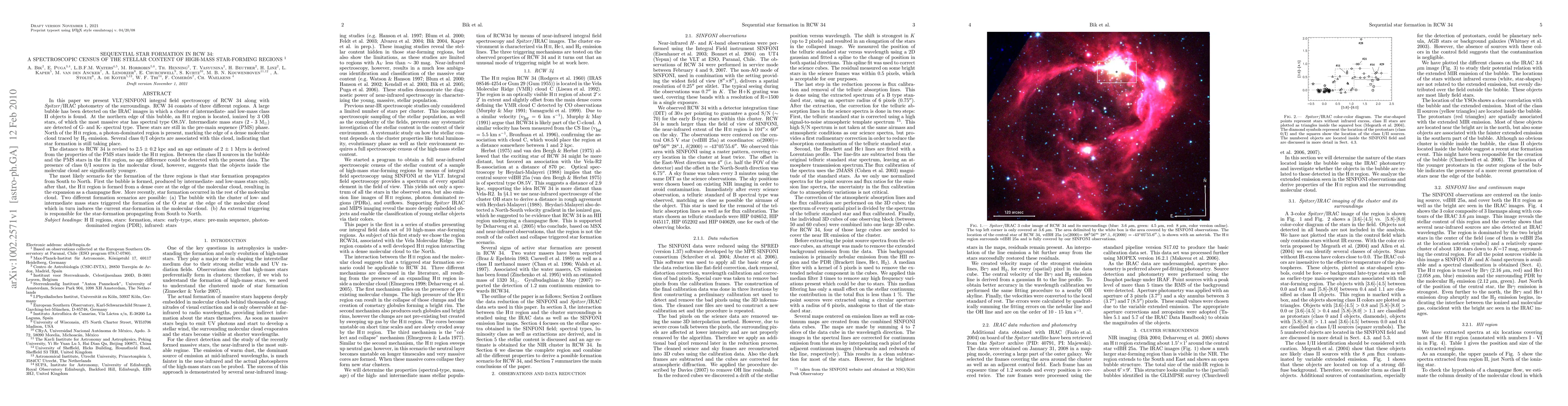 This paper uses VLT/SINFONI spectroscopy and Spitzer/IRAC photometry to study RCW 34, revealing sequential star formation across three regions. The findings suggest star formation propagates from south to north, starting with a bubble formed by intermediate- and low-mass stars, followed by an HII region ionized by OB stars, and most recently, ongoing star formation in a dense molecular cloud.