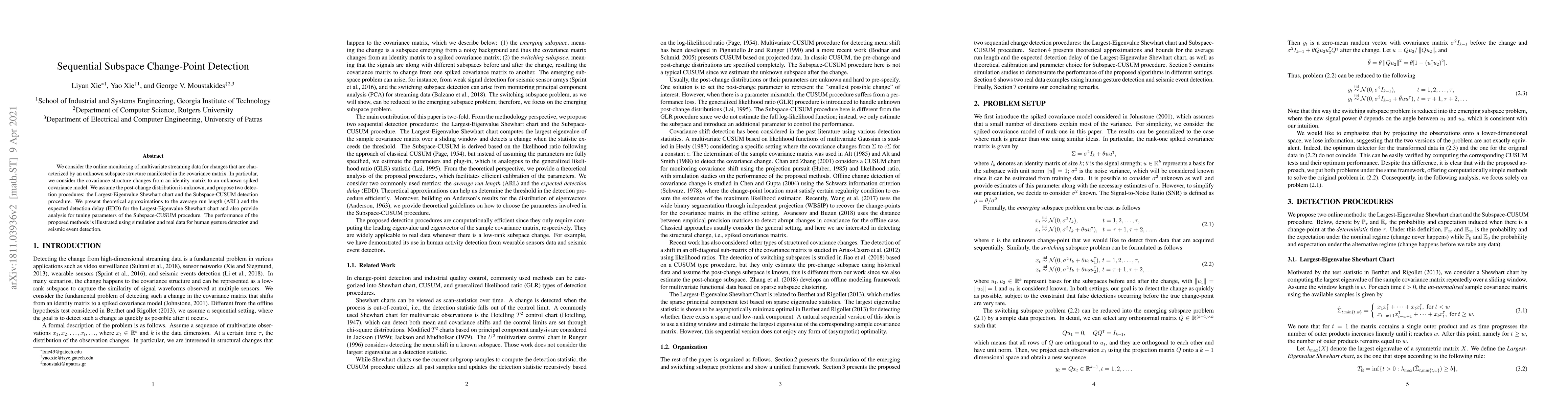 This paper proposes two methods for detecting changes in multivariate streaming data with unknown subspace structure, including a Largest-Eigenvalue Shewhart chart and the Subspace-CUSUM procedure, to monitor covariance matrix changes from identity to spiked models.