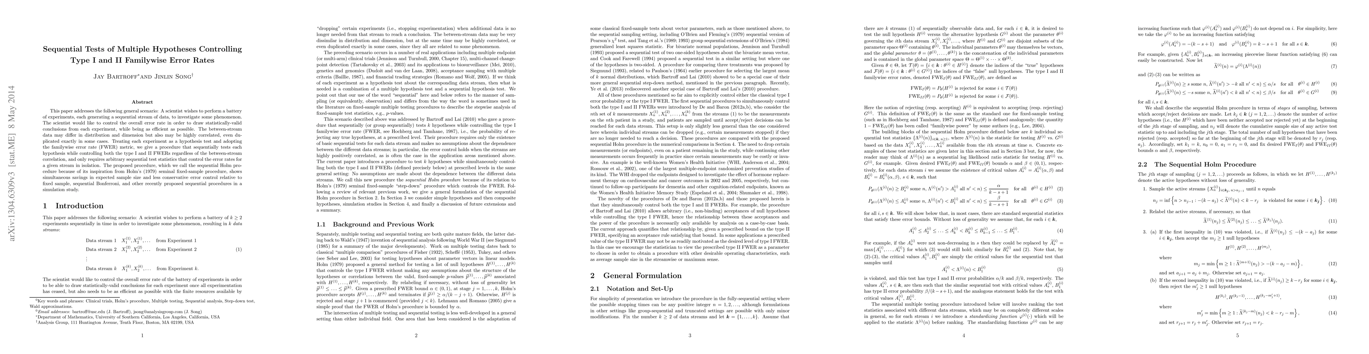 This paper presents a sequential testing procedure for multiple hypotheses, controlling both Type I and Type II familywise error rates. It introduces the sequential Holm procedure, which does not require knowledge of the correlation structure among data streams and uses arbitrary sequential test statistics.