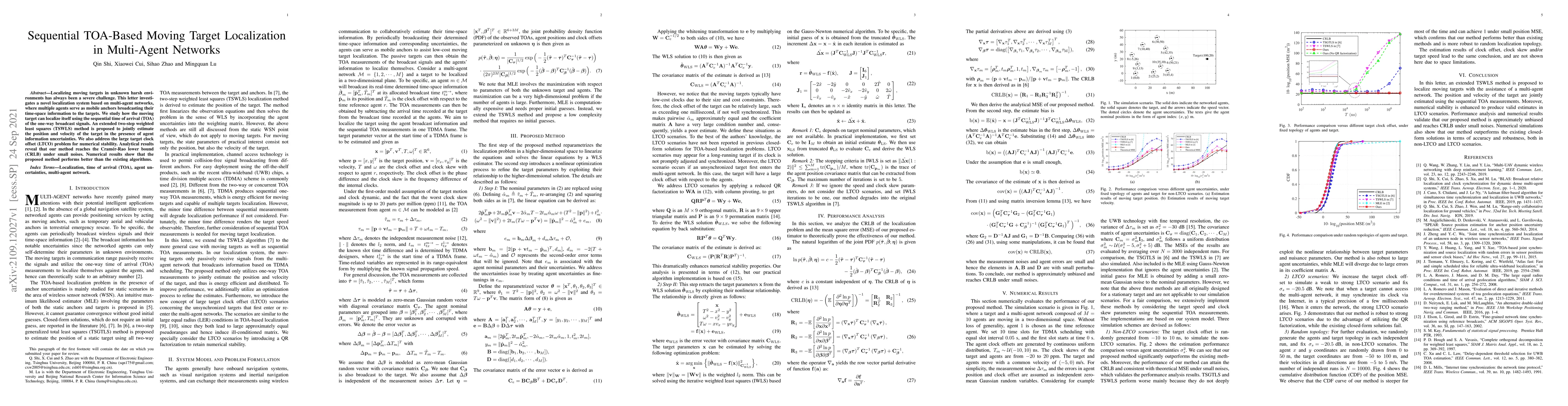 This paper proposes a novel localization system for moving targets in unknown environments using multi-agent networks, where agents broadcast time-space information. An extended two-step weighted least squares method is introduced to estimate target position and velocity, addressing uncertainties and large target clock offset issues, and achieving near-optimal performance as shown by analytical and numerical results.