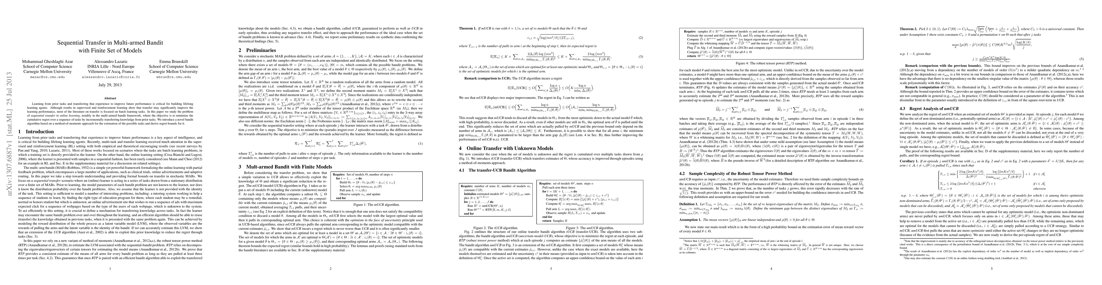 This paper investigates sequential transfer learning in online multi-armed bandit tasks to minimize cumulative regret by incrementally transferring knowledge from prior tasks. A novel bandit algorithm based on a method-of-moments approach is introduced, along with derived regret bounds.