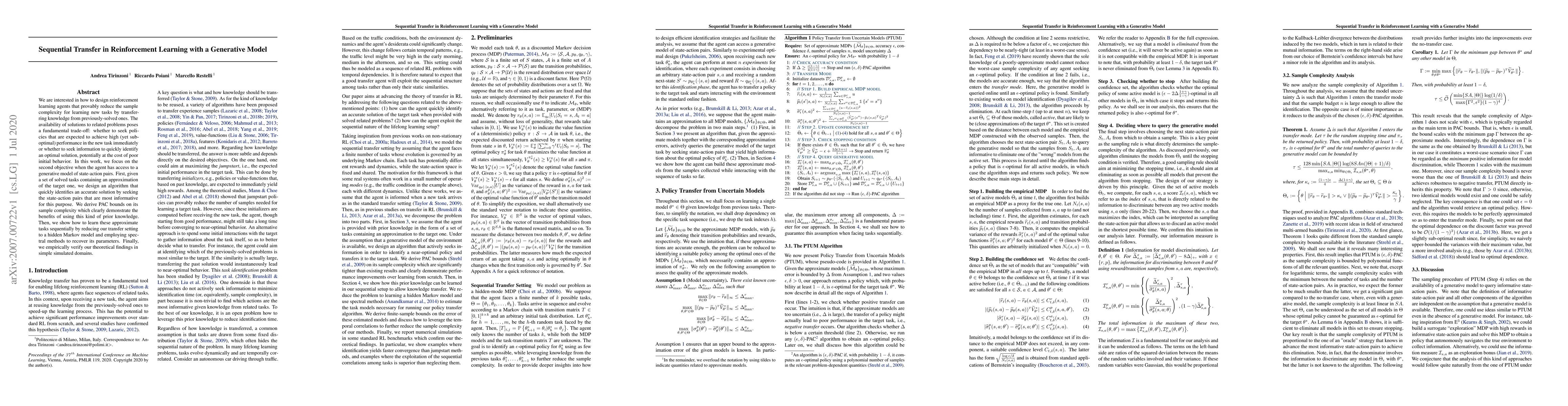 A new algorithm is proposed for reinforcement learning that uses a generative model to quickly identify an accurate solution to a new task by leveraging knowledge from previously solved tasks. The algorithm's sample complexity is shown to be significantly reduced compared to traditional methods.
