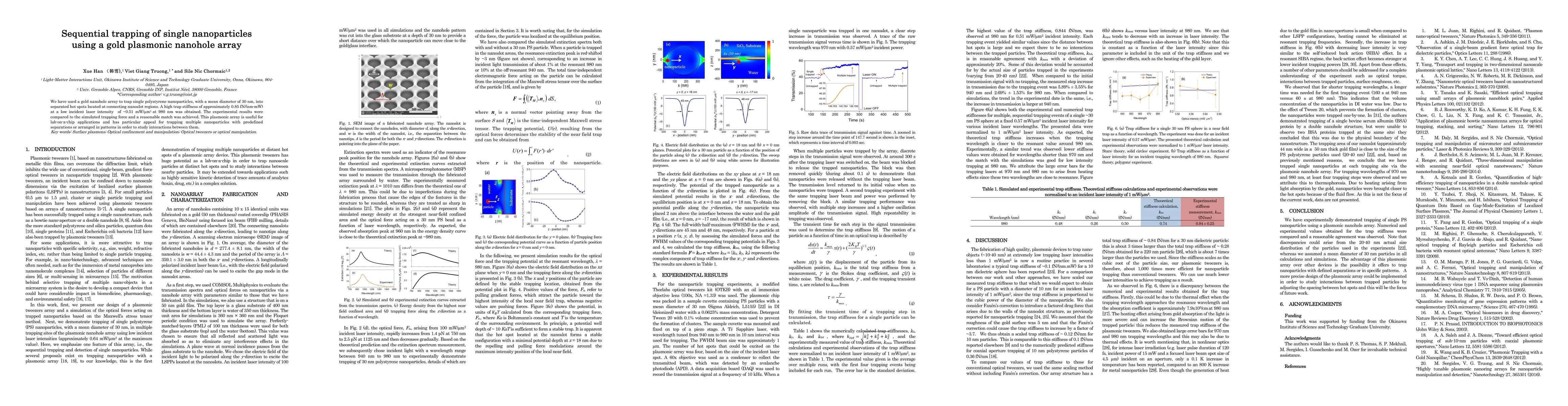 This paper describes the use of a gold nanohole array to trap single 30 nm polystyrene nanoparticles in distinct hot spots, achieving a high trap stiffness of 0.85 fN/(nmmW) at low laser intensity. The experimental results align well with simulations, highlighting potential for lab-on-a-chip applications in studying nanoparticle interactions.