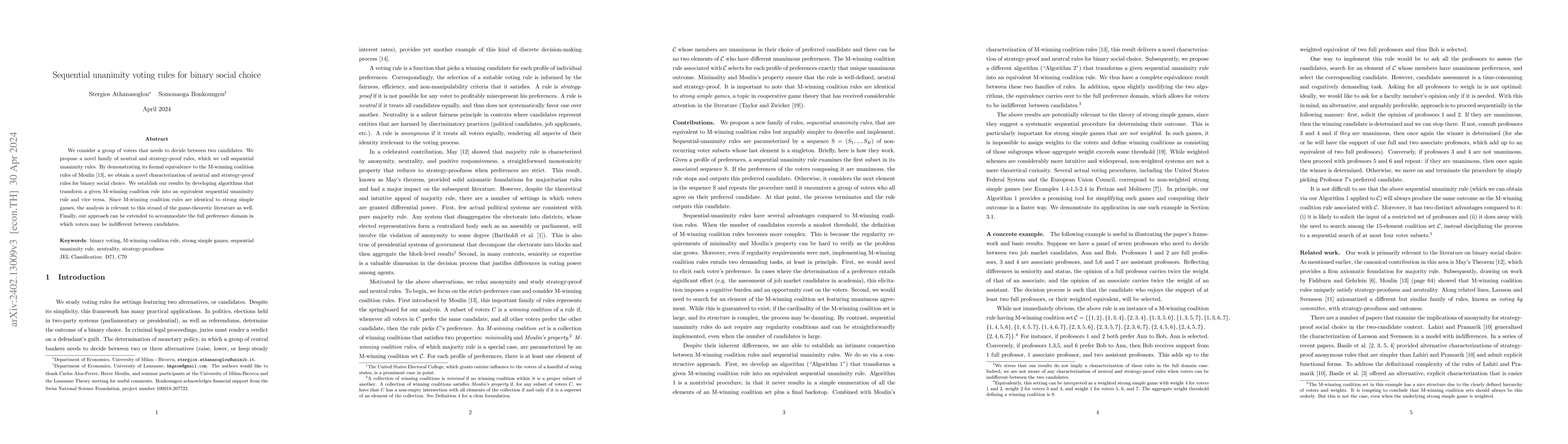 This paper introduces a new set of voting rules called sequential unanimity rules for binary social choice, demonstrating their equivalence to Moulin's M-winning coalition rules. These rules are shown to be neutral and strategy-proof, with developed algorithms to transform between the two rule types.