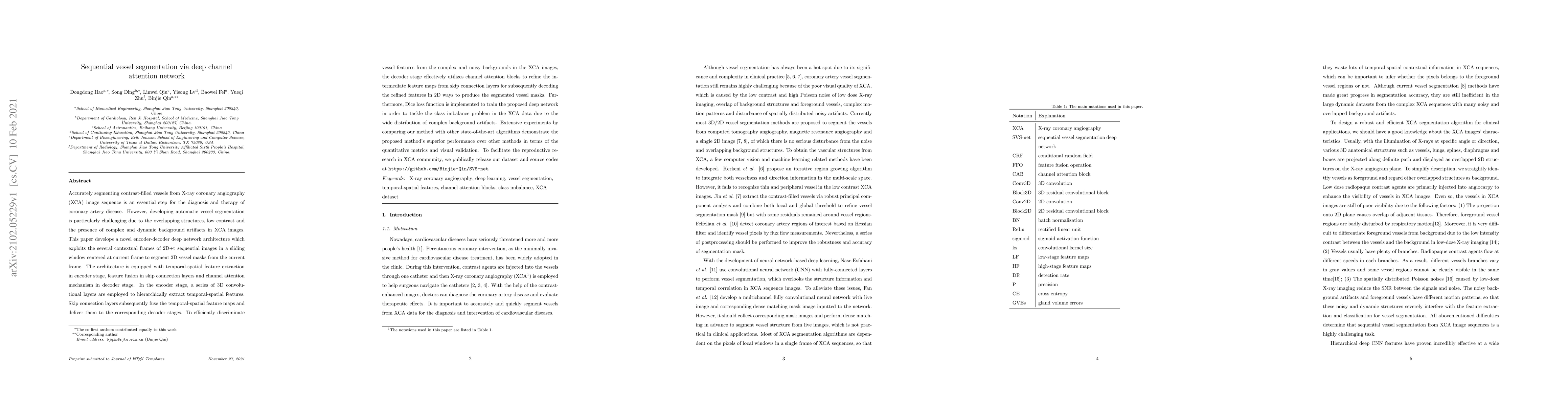 This paper proposes a deep channel attention network for segmenting vessels in sequential 2D+t images, utilizing temporal-spatial feature extraction, feature fusion, and channel attention mechanisms to refine vessel masks. The method outperforms other algorithms in both quantitative metrics and visual validation.