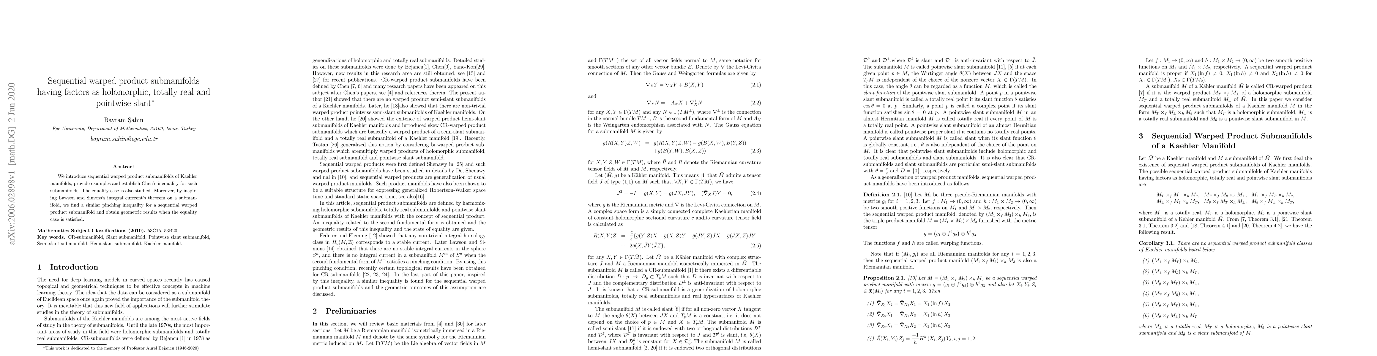 This paper introduces sequential warped product submanifolds within Kaehler manifolds, provides examples, and establishes Chen's inequality for these submanifolds. It also explores a pinching inequality inspired by Lawson and Simons's integral current theorem, deriving geometric results when the equality case holds.