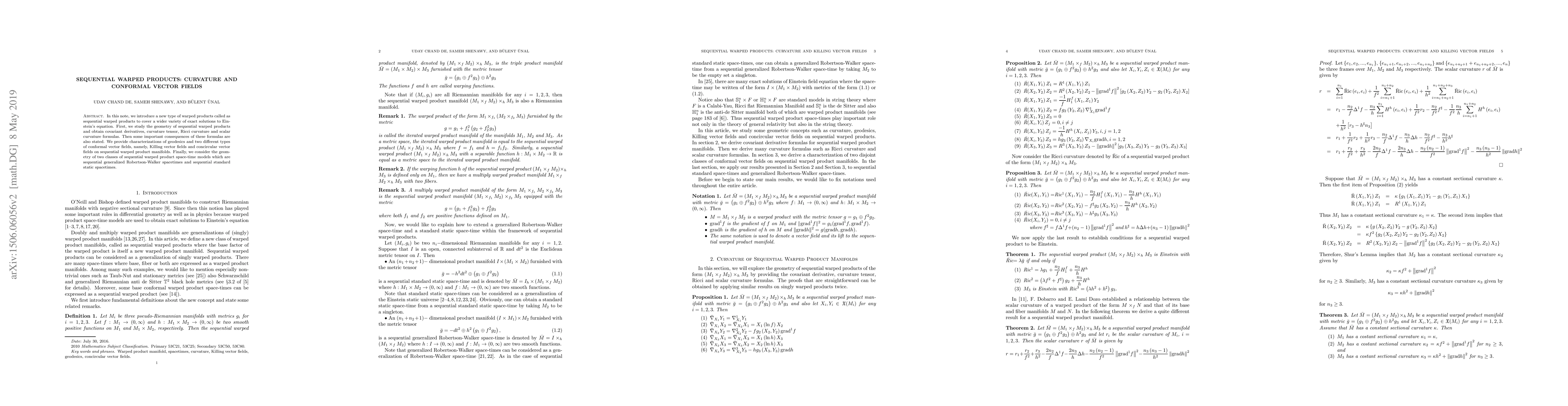 This paper introduces sequential warped products, a new geometric construct to explore a broader range of exact solutions to Einstein's equations. It derives geometric properties, including curvature tensors and Killing vector fields, and examines their implications for geodesics and conformal vector fields on these manifolds.