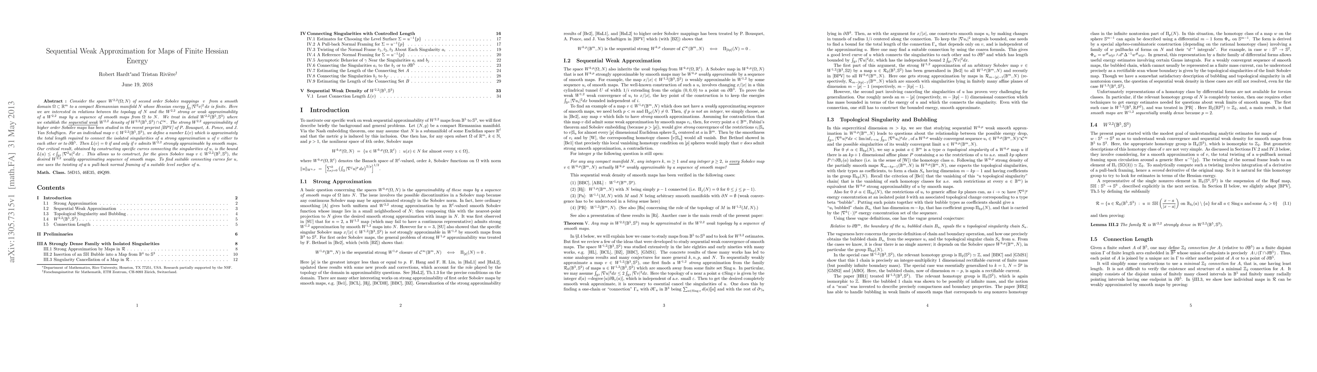 Consider the space $W^{2,2}(\Omega;N)$ of second order Sobolev mappings $\ v\ $ from a smooth domain $\Omega\subset\R^m$ to a compact Riemannian manifold $N$ whose Hessian energy $\int_\Omega |\nabla^2 v|^2\, dx$ is finite. Here we are interested in relations between the topology of $N$ and the $W^{2,2}$ strong or weak approximability of a $W^{2,2}$ map by a sequence of smooth maps from $\Omega$ to $N$. We treat in detail $W^{2,2}(\B^5,S^3)$ where we establish the \underline{sequential weak} $W^{2,2}$ density of $W^{2,2}(\B^5,S^3)\cap{\mathcal C}^\infty$. The strong $W^{2,2}$ approximability of higher order Sobolev maps has been studied in the recent preprint \cite{BPV} of P. Bousquet, A. Ponce, and J. Van Schaftigen. For an individual map $v\in W^{2,2}(\B^5,S^3)$, we define a number $L(v)$ which is approximately the total length required to connect the isolated singularities of a strong approximation $u$ of $v$ either to each other or to $\p\B^5$. Then $L(v)=0$ if and only if $v$ admits $W^{2,2}$ strongly approximable by smooth maps. Our critical result, obtained by constructing specific curves connecting the singularities of $u$, is the bound $\ L(u)\leq c\int_{\B^5}|\nabla^2 u|^2\, dx\ $. This allows us to construct, for the given Sobolev map $v\in W^{2,2}(\B^5,S^3)$, the desired $W^{2,2}$ weakly approximating sequence of smooth maps. To find suitable connecting curves for $u$, one uses the twisting of a $u$ pull-back normal framing of a suitable level surface of $u$