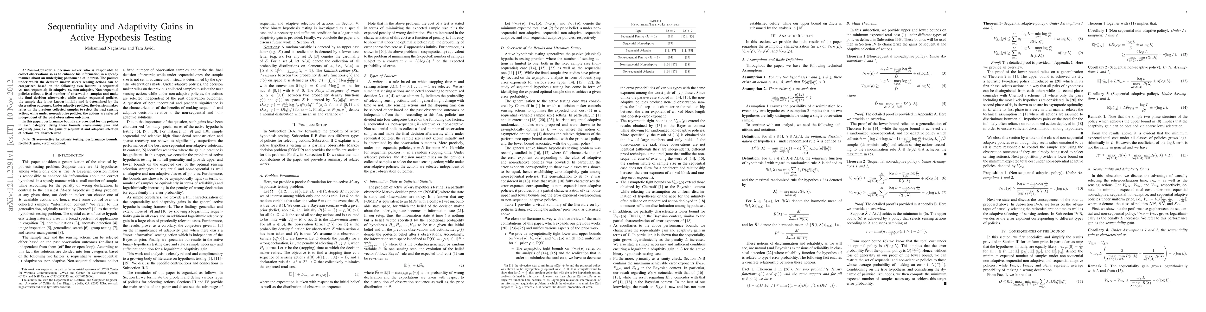 Consider a decision maker who is responsible to collect observations so as to enhance his information in a speedy manner about an underlying phenomena of interest. The policies under which the decision maker selects sensing actions can be categorized based on the following two factors: i) sequential vs. non-sequential; ii) adaptive vs. non-adaptive. Non-sequential policies collect a fixed number of observation samples and make the final decision afterwards; while under sequential policies, the sample size is not known initially and is determined by the observation outcomes. Under adaptive policies, the decision maker relies on the previous collected samples to select the next sensing action; while under non-adaptive policies, the actions are selected independent of the past observation outcomes. In this paper, performance bounds are provided for the policies in each category. Using these bounds, sequentiality gain and adaptivity gain, i.e., the gains of sequential and adaptive selection of actions are characterized.