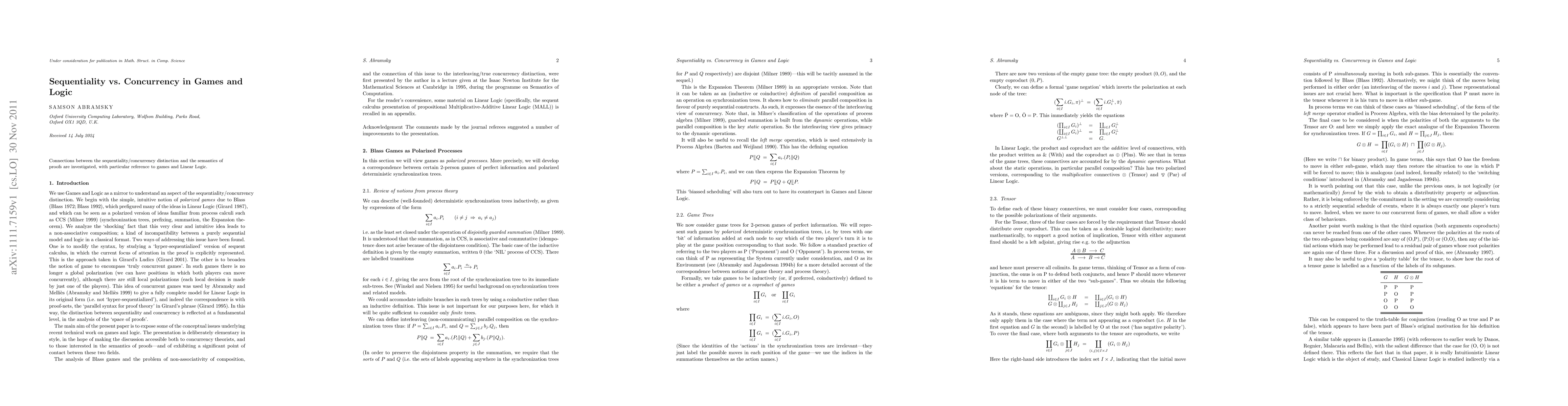 Connections between the sequentiality/concurrency distinction and the semantics of proofs are investigated, with particular reference to games and Linear Logic.