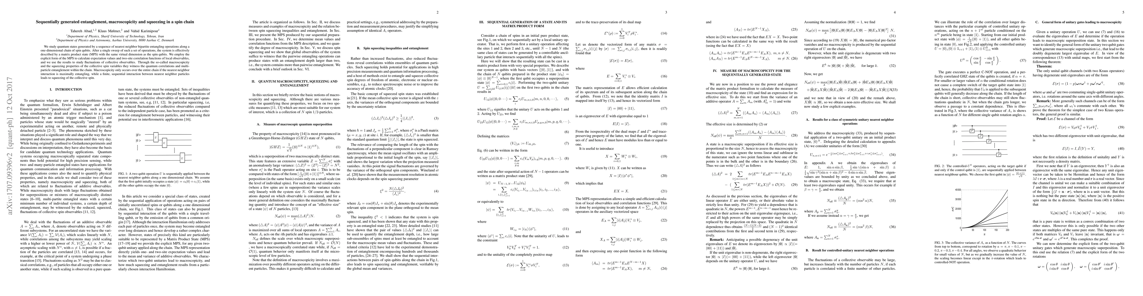 We study quantum states generated by a sequence of nearest neighbor bipartite entangling operations along a one-dimensional chain of spin qubits. After a single sweep of such a set of operations, the system is effectively described by a matrix product state (MPS) with the same virtual dimension as the spin qubits. We employ the explicit form of the MPS to calculate expectation values and two-site correlation functions of local observables, and we use the results to study fluctuations of collective observables. Through the so-called macroscopicity and the squeezing properties of the collective spin variables they witness the quantum correlations and multi-particle entanglement within the chain. Macroscopicity only occurs over the entire chain if the nearest neighbor interaction is maximally entangling, while a finite, sequential interaction between nearest neighbor particles leads to squeezing of the collective spin.