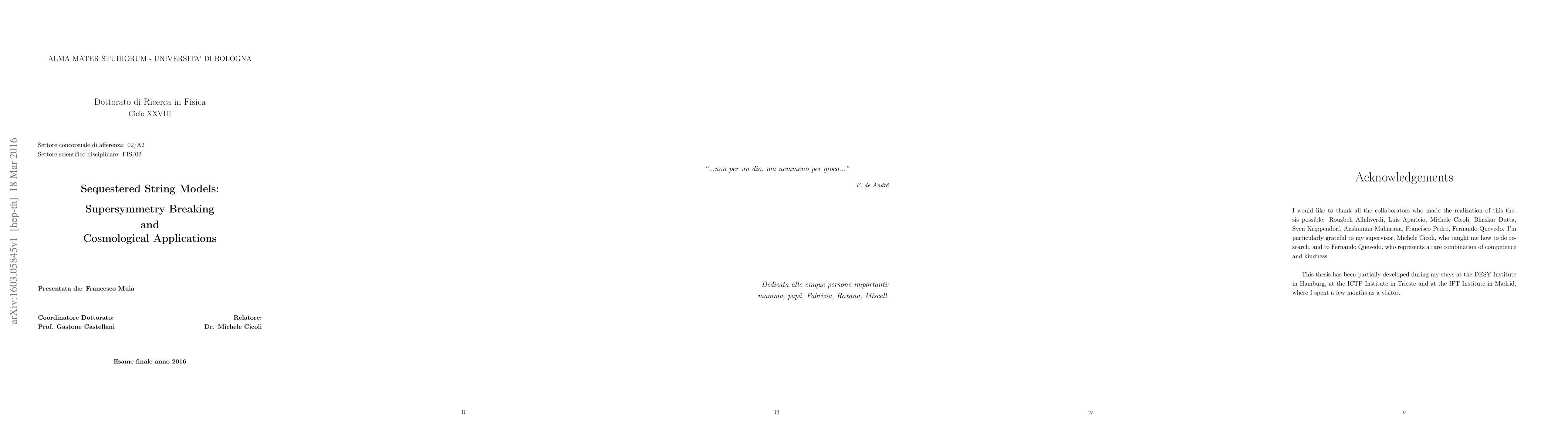 In the present thesis I studied the phenomenology arising from a class of string models called sequestered compactifications, which were born with the aim of getting low-energy SUSY from strings. This is not an easy task if combined with cosmological constraints, since the mechanism of moduli stabilization fixes both the scale of supersymmetric particles and the scale of moduli, which tend to be of the same order. However, if on the one hand supersymmetric particles with TeV mass are desired in order to address the hierarchy problem, on the other hand the cosmological moduli problem requires the moduli to be heavier than 100 TeV. The specific setup of sequestered compactifications makes this hierarchy achievable, at least in principle: as in these models the visible sector is located on a stack of D3-branes at singularities, a physical separation between the visible degrees of freedom and the SUSY-breaking sources takes place. Such decoupling translates into a hierarchy between the scale of SUSY-breaking and the spectrum of supersymmetric particles. Moreover, it is interesting to notice that moduli are the four-dimensional manifestation of the existence of extra-dimensions, and then their presence is a common feature of all string compactifications. Since they are gravitationally coupled, they could decay late in the history of the universe, affecting in a significant way its cosmological evolution. Possible deviations of the cosmological observables from the values predicted by the standard Hot Big Bang Theory constitute an interesting alternative for the discovery of BSM physics, which is complementary to the particle physics search. For this reason in addition to SUSY-breaking in sequestered models, I also studied several cosmological scenarios arising from them, such as production of non-thermal dark matter and dark radiation, reheating from moduli decay and inflation.