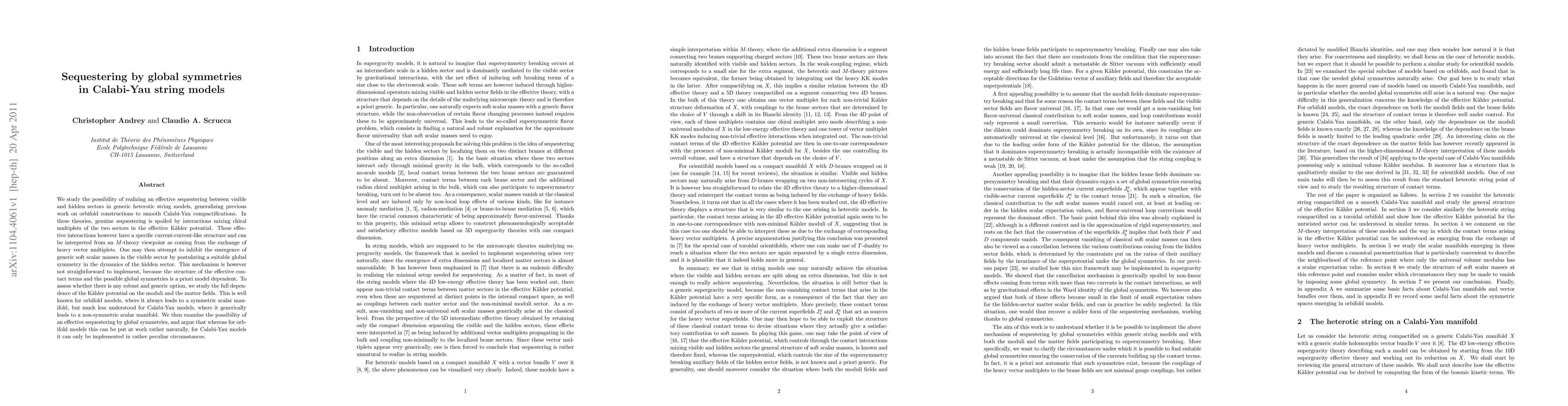 We study the possibility of realizing an effective sequestering between visible and hidden sectors in generic heterotic string models, generalizing previous work on orbifold constructions to smooth Calabi-Yau compactifications. In these theories, genuine sequestering is spoiled by interactions mixing chiral multiplets of the two sectors in the effective Kahler potential. These effective interactions however have a specific current-current-like structure and can be interpreted from an M-theory viewpoint as coming from the exchange of heavy vector multiplets. One may then attempt to inhibit the emergence of generic soft scalar masses in the visible sector by postulating a suitable global symmetry in the dynamics of the hidden sector. This mechanism is however not straightforward to implement, because the structure of the effective contact terms and the possible global symmetries is a priori model dependent. To assess whether there is any robust and generic option, we study the full dependence of the Kahler potential on the moduli and the matter fields. This is well known for orbifold models, where it always leads to a symmetric scalar manifold, but much less understood for Calabi-Yau models, where it generically leads to a non-symmetric scalar manifold. We then examine the possibility of an effective sequestering by global symmetries, and argue that whereas for orbifold models this can be put at work rather naturally, for Calabi-Yau models it can only be implemented in rather peculiar circumstances.