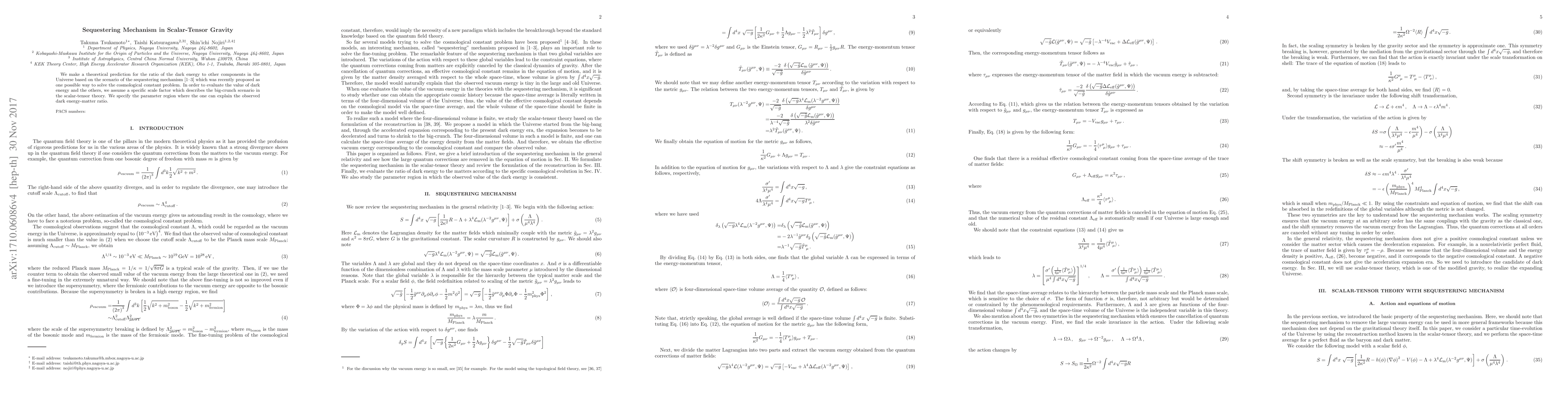 We make a theoretical prediction for the ratio of the dark energy to other components in the Universe based on the scenario of the sequestering mechanism which was recently proposed as one possible way to solve the cosmological constant problem. In order to evaluate the value of dark energy and the others, we assume a specific scale factor which describes the Big-Crunch scenario in the scalar-tensor theory. We specify the parameter region where the one can explain the observed dark energy-matter ratio.