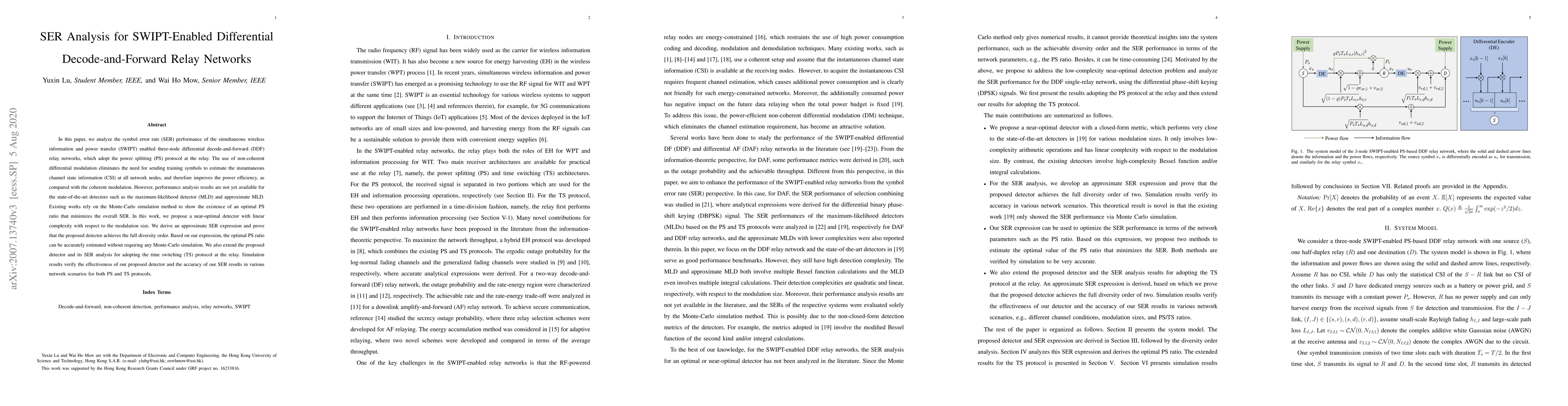 In this paper, we analyze the symbol error rate (SER) performance of the simultaneous wireless information and power transfer (SWIPT) enabled three-node differential decode-and-forward (DDF) relay networks, which adopt the power splitting (PS) protocol at the relay. The use of non-coherent differential modulation eliminates the need for sending training symbols to estimate the instantaneous channel state information (CSI) at all network nodes, and therefore improves the power efficiency, as compared with the coherent modulation. However, performance analysis results are not yet available for the state-of-the-art detectors such as the maximum-likelihood detector (MLD) and approximate MLD. Existing works rely on the Monte-Carlo simulation method to show the existence of an optimal PS ratio that minimizes the overall SER. In this work, we propose a near-optimal detector with linear complexity with respect to the modulation size. We derive an approximate SER expression and prove that the proposed detector achieves the full diversity order. Based on our expression, the optimal PS ratio can be accurately estimated without requiring any Monte-Carlo simulation. We also extend the proposed detector and its SER analysis for adopting the time switching (TS) protocol at the relay. Simulation results verify the effectiveness of our proposed detector and the accuracy of our SER results in various network scenarios for both PS and TS protocols.