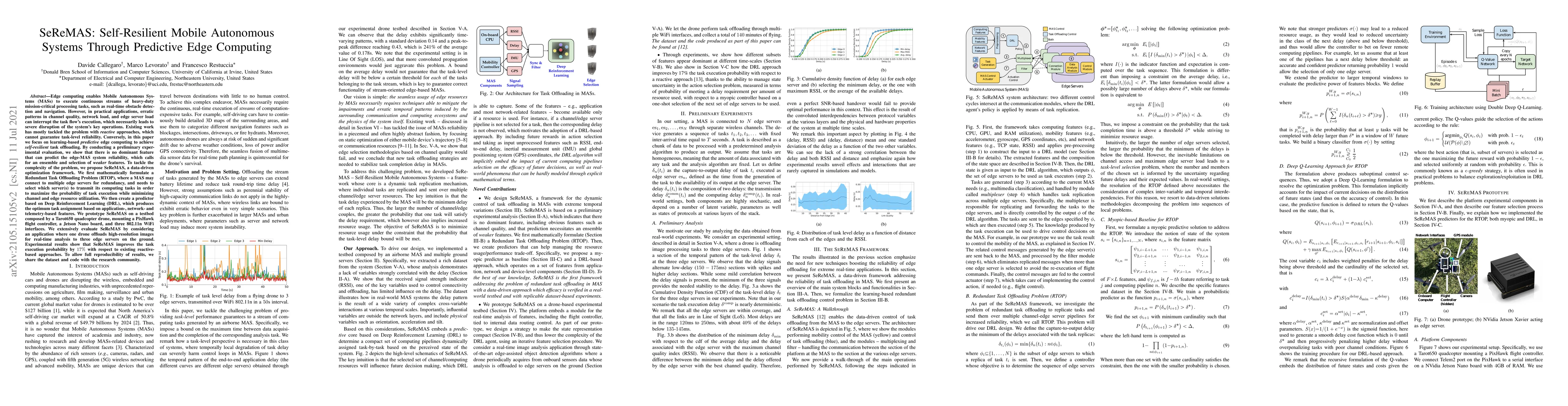 SeReMAS leverages predictive edge computing to enhance the self-resilience of Mobile Autonomous Systems (MASs) through optimal task offloading. The proposed framework uses Deep Reinforcement Learning to select the best edge servers for task execution, improving task execution probability by 17% compared to reactive approaches.