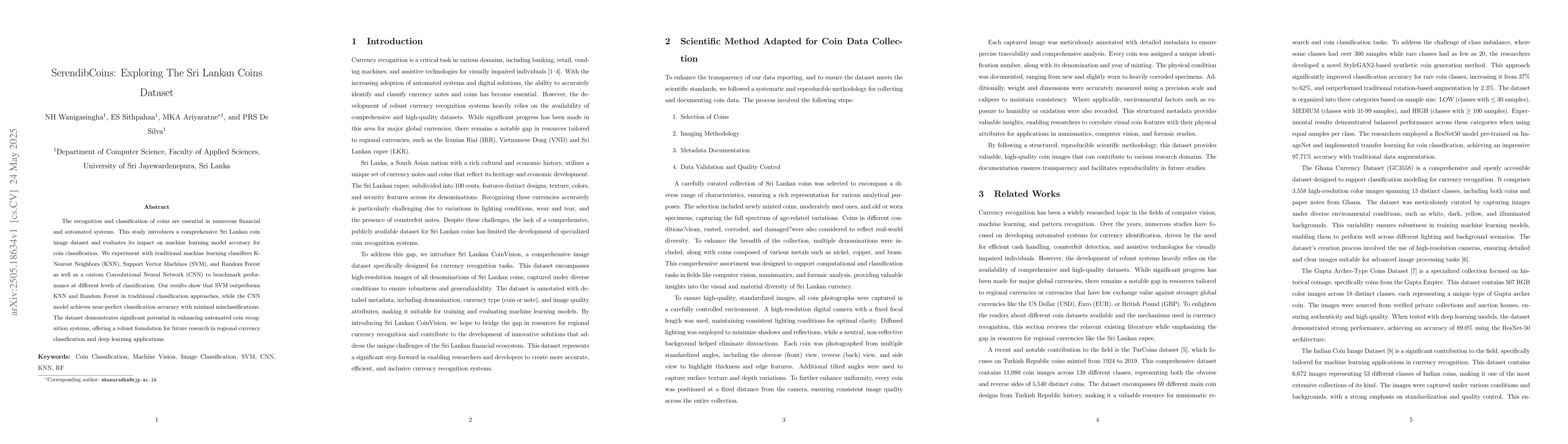 The study introduces a comprehensive Sri Lankan coin image dataset and evaluates its impact on machine learning model accuracy for coin classification, using K-Nearest Neighbors (KNN), Support Vector Machines (SVM), Random Forest, and a Convolutional Neural Network (CNN).