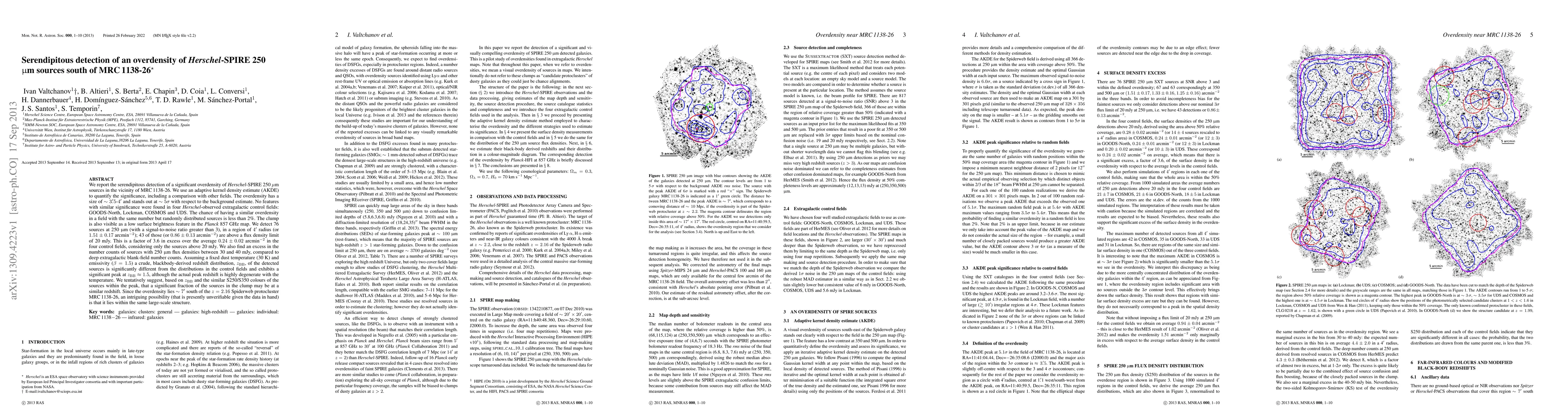 We report the serendipitous detection of a significant overdensity of Herschel-SPIRE 250 micron sources in the vicinity of MRC1138-26. We use an adaptive kernel density estimate to quantify the significance, including a comparison with other fields. The overdensity has a size of ~3.5-4' and stands out at ~5sigma with respect to the background estimate. No features with similar significance were found in four extragalactic control fields: GOODS-North, Lockman, COSMOS and UDS. The chance of having a similar overdensity in a field with the same number but randomly distributed sources is less than 2%. The clump is also visible as a low surface brightness feature in the Planck 857 GHz map. We detect 76 sources at 250 micron (with a signal-to-noise ratio greater than 3), in a region of 4' radius; 43 of those are above a flux density limit of 20 mJy. This is a factor of 3.6 in excess over the average in the four control fields, considering only the sources above 20 mJy. We also find an excess in the number counts of sources with 250 micron flux densities between 30 and 40 mJy, compared to deep extragalactic blank-field number counts. Assuming a fixed dust temperature (30 K) and emissivity (beta=1.5) a crude, blackbody-derived redshift distribution, zBB, of the detected sources is significantly different from the distributions in the control fields and exhibits a significant peak at zBB ~ 1.5, although the actual peak redshift is highly degenerate with the temperature. We tentatively suggest, based on zBB and the similar S250/S350 colours of the sources within the peak, that a significant fraction of the sources in the clump may be at a similar redshift. Since the overdensity lies ~7' south of the z=2.16 Spiderweb protocluster MRC1138-26, an intriguing possibility (that is presently unverifiable given the data in hand) is that it lies within the same large-scale structure.(abridged)