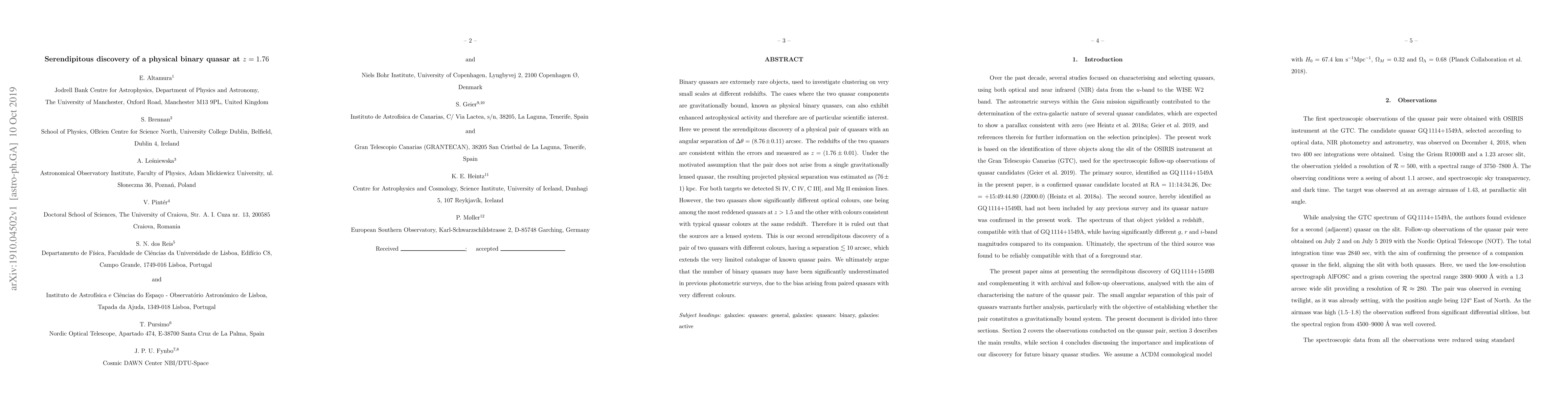 This paper reports the serendipitous discovery of a physical binary quasar at redshift z=1.76, with an angular separation of 8.76 arcsec and a projected physical separation of 76 kpc. The quasars exhibit different optical colors, ruling out a lensed system, and suggest that binary quasars may be more common than previously estimated.