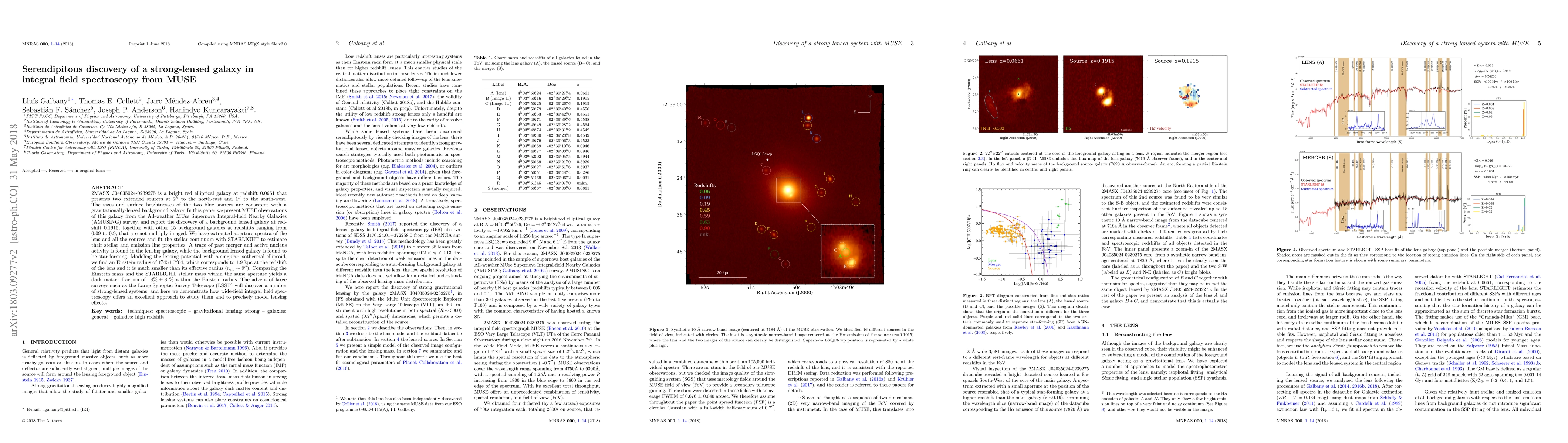 This paper reports the serendipitous discovery of a strong-lensed galaxy using MUSE integral field spectroscopy, revealing a background galaxy at redshift 0.1915 lensed by a foreground elliptical galaxy. The study estimates the Einstein radius and dark matter fraction, highlighting the potential of wide-field integral field spectroscopy for future large-scale surveys.