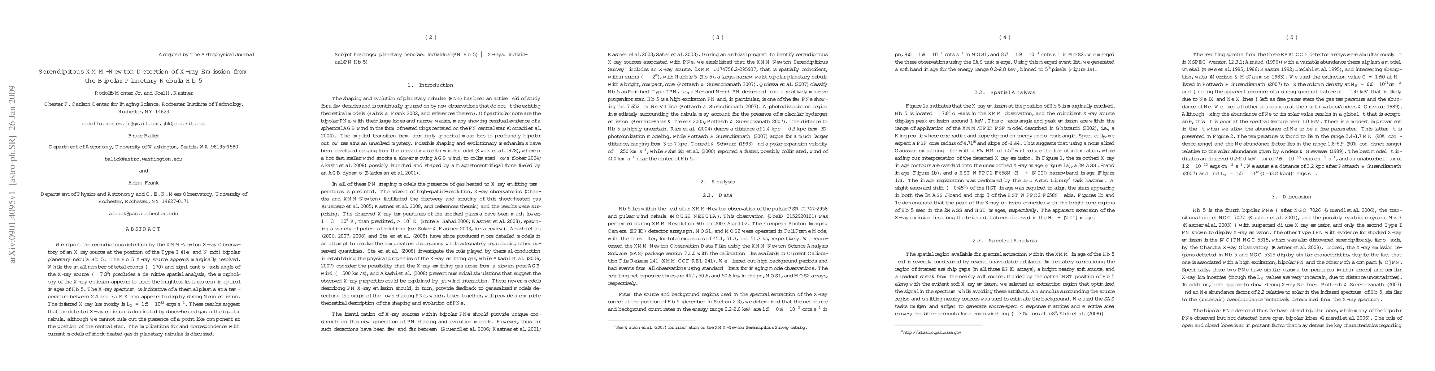 The XMM-Newton Observatory detected X-ray emission from bipolar planetary nebula Hb 5, suggesting shock-heated gas in the nebula. The X-ray spectrum indicates a temperature of 2.4 to 3.7 MK and a luminosity of 1.5 x 10^32 ergs/s.