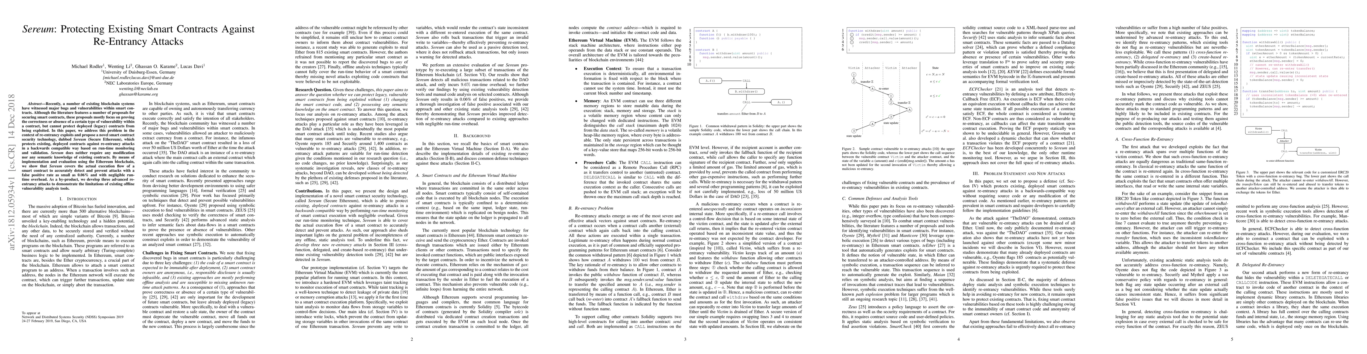 Sereum is a novel runtime security technology designed to protect existing Ethereum smart contracts against re-entrancy attacks without requiring modifications to the contracts. It achieves this through real-time monitoring and validation, demonstrating minimal false positives and negligible performance overhead.
