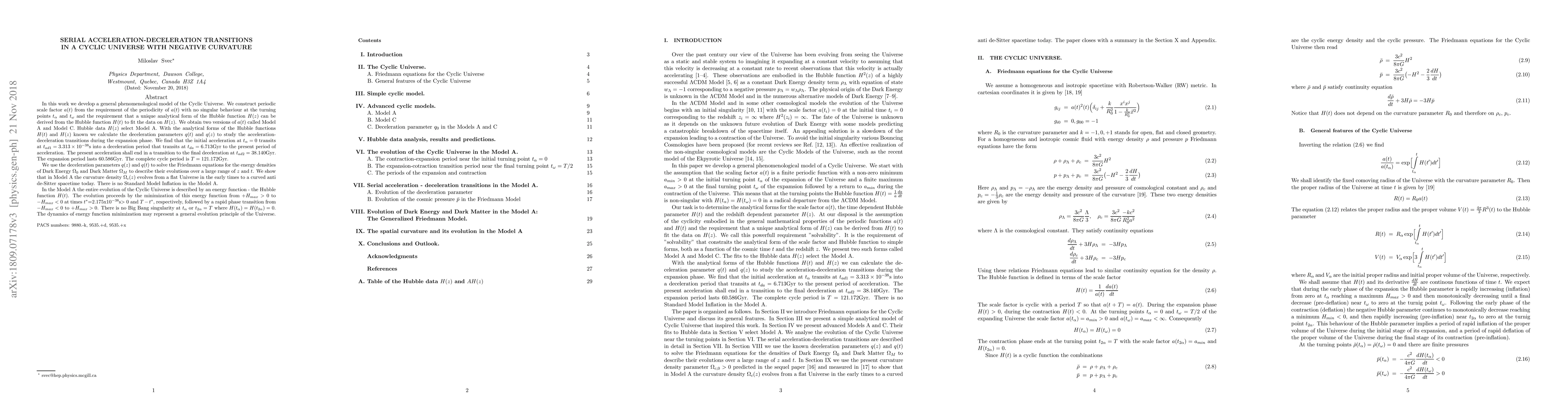 In this work we develop a general phenomenological model of the Cyclic Universe. We construct periodic scale factor a(t) from the requirements of the periodicity of a(t) with no singular behavior at the turning points t_\alpha and t_\omega and the requirement that a unique analytical form of the Hubble function H(z) can be derived from the Hubble function H(t) to fit the data on H(z). We obtain two versions of a(t) called Model A and Model C. Hubble data select Model A. With the analytical forms of the Hubble functions H(t) and H(z) known we calculate the deceleration parameters q(t) and q(z) to study the acceleration-deceleration transitions during the expansion phase. We find that the initial acceleration at t_\alpha=0 transits at t_{ad1}=3.313x10^{-38}s into deceleration period that transits at t_{da}=6.713 Gyr to the present period of acceleration. The present acceleration shall end in a transition to the final deceleration at t_{ad2}=38.140 Gyr. The expansion period lasts 60.586 Gyr. The complete cycle period is T=121.172 Gyr. We use the deceleration parameters q(z) and q(t) to solve the Friedmann equations for the energy densities of Dark Energy \Omega_0 and Dark Matter \Omega_M to describe their evolutions over a large range of z and t. We show that in the Model A the curvature density \Omega_c(z) evolves from a flat Universe in the early times to a curves anti de-Sitter spacetime today. There is no Standard Model Inflation in the Model A.