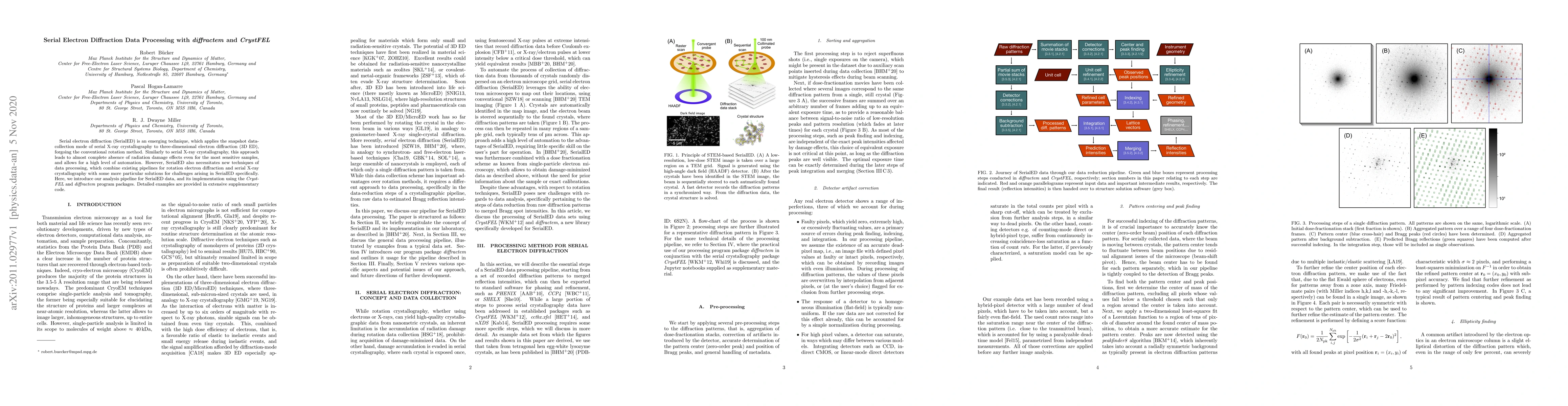 Serial electron diffraction (SerialED) is an emerging technique, which applies the snapshot data-collection mode of serial X-ray crystallography to three-dimensional electron diffraction (3D ED), forgoing the conventional rotation method. Similarly to serial X-ray crystallography, this approach leads to almost complete absence of radiation damage effects even for the most sensitive samples, and allows for a high level of automation. However, SerialED also necessitates new techniques of data processing, which combine existing pipelines for rotation electron diffraction and serial X-ray crystallography with some more particular solutions for challenges arising in SerialED specifically. Here, we introduce our analysis pipeline for SerialED data, and its implementation using the CrystFEL and diffractem program packages. Detailed examples are provided in extensive supplementary code.