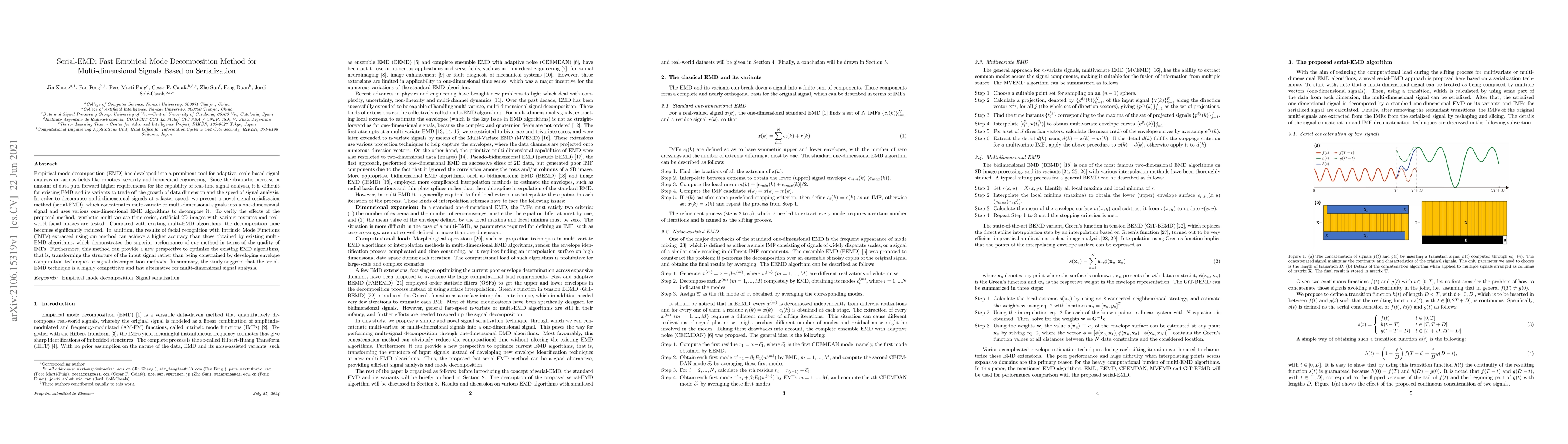 Serial-EMD is a fast method for analyzing multi-dimensional signals by serializing them into one dimension, reducing decomposition time compared to existing algorithms, with improved accuracy in facial recognition applications.