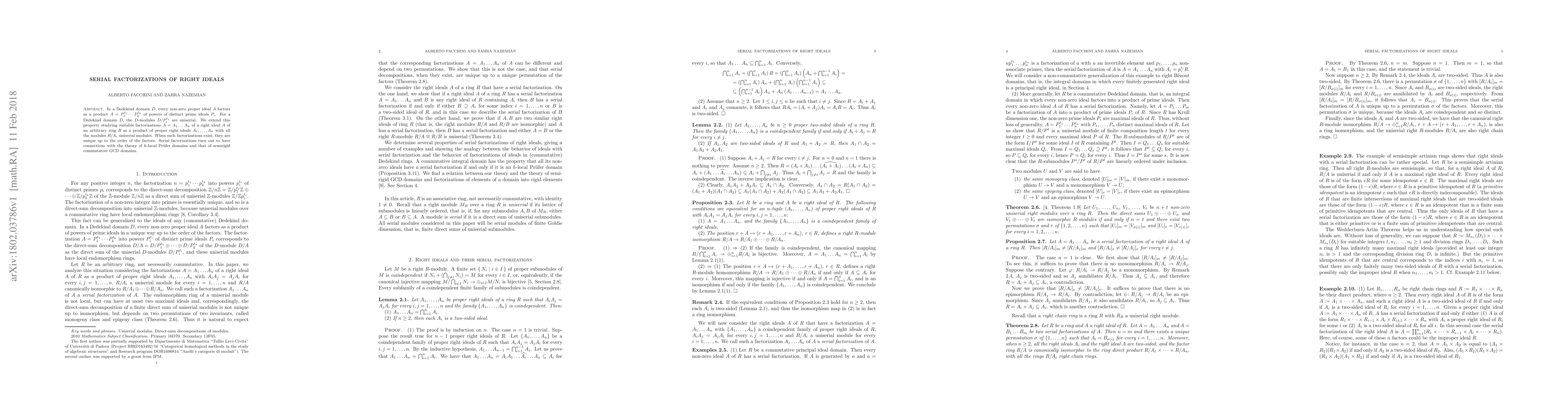 In a Dedekind domain $D$, every non-zero proper ideal $A$ factors as a product $A=P_1^{t_1}\cdots P_k^{t_k}$ of powers of distinct prime ideals $P_i$. For a Dedekind domain $D$, the $D$-modules $D/P_i^{t_i}$ are uniserial. We extend this property studying suitable factorizations $A=A_1\dots A_n$ of a right ideal $A$ of an arbitrary ring $R$ as a product of proper right ideals $A_1,\dots,A_n$ with all the modules $R/A_i$ uniserial modules. When such factorizations exist, they are unique up to the order of the factors. Serial factorizations turn out to have connections with the theory of $h$-local Pr\"ufer domains and that of semirigid commutative GCD domains.