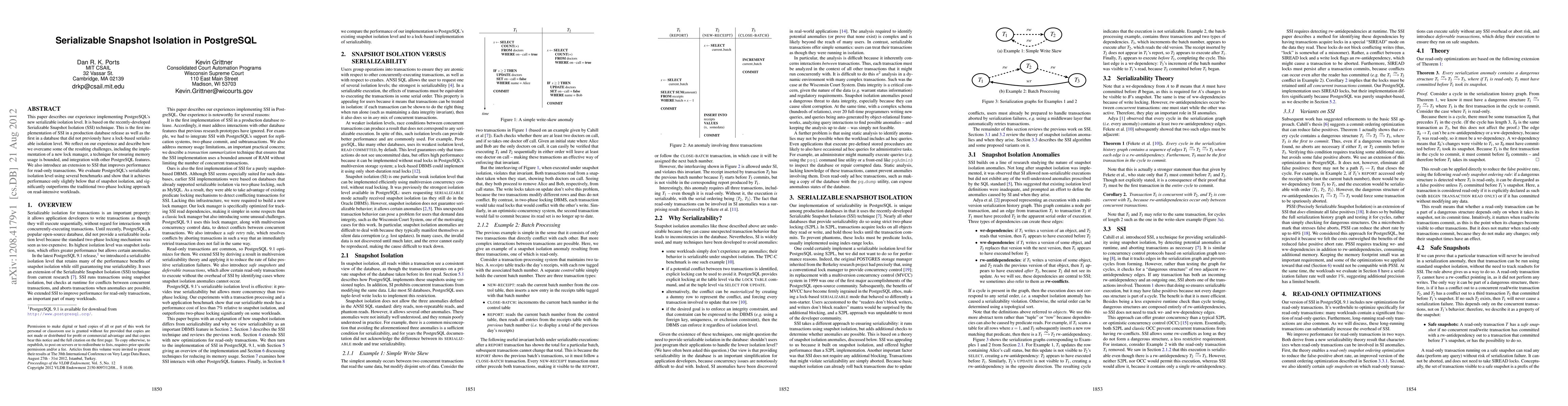 This paper details PostgreSQL's implementation of Serializable Snapshot Isolation (SSI), the first in a production database without prior lock-based serializable isolation. It discusses overcoming challenges and introduces a performance-enhancing read-only transaction extension, demonstrating comparable performance to snapshot isolation and superior results on read-heavy workloads.