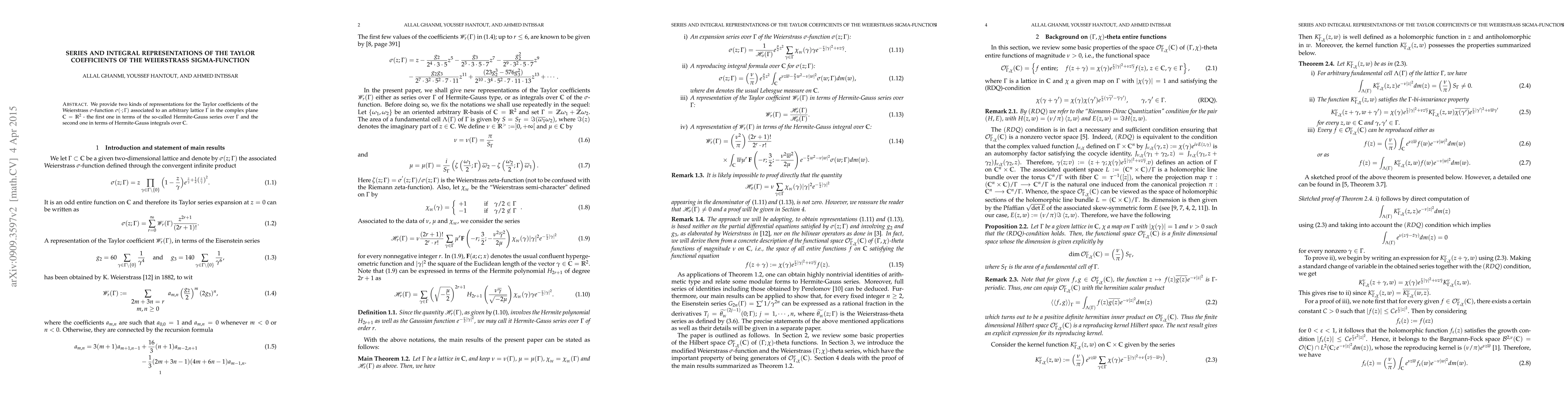 We provide two kinds of representations for the Taylor coefficients of the Weierstrass $\sigma$-function $\sigma(\cdot;\Gamma)$ associated to an arbitrary lattice $\Gamma$ in the complex plane $\mathbb{C}=\mathbb{R}^2$ - the first one in terms of the so-called Hermite-Gauss series over $\Gamma$ and the second one in terms of Hermite-Gauss integrals over $\mathbb{C}$.