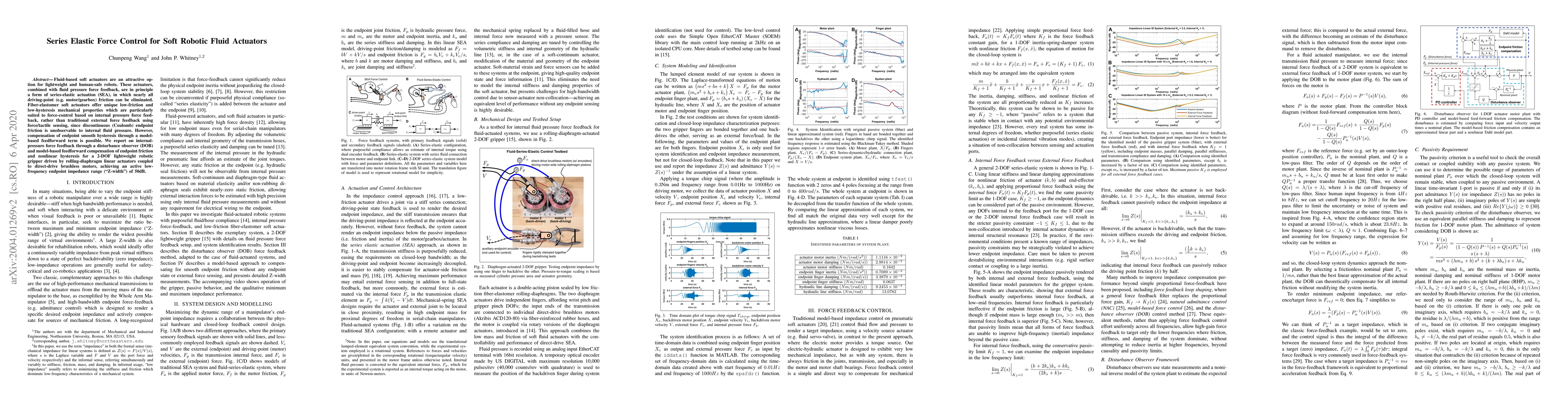 This paper explores series elastic force control for fluid-based soft robotic actuators, demonstrating the use of internal pressure feedback to eliminate friction and compensate for hysteresis in a 2-DOF gripper. The approach achieves a low-frequency impedance range of 50dB through a disturbance observer and model-based feedforward.
