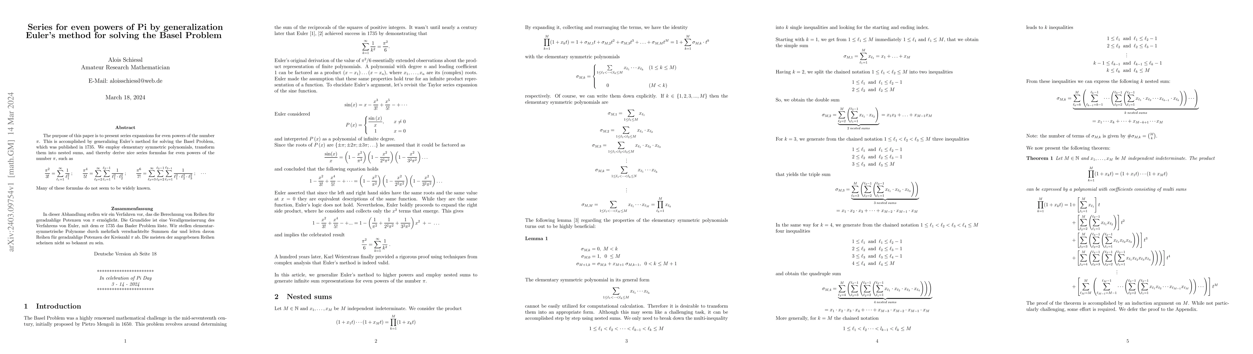 This paper presents series expansions for even powers of π by generalizing Euler's 1735 method for solving the Basel Problem, using elementary symmetric polynomials and nested sums to derive new formulas for π². Dies ist eine Abhandlung über ein Verfahren zur Berechnung von Reihen für geradzahlige Potenzen von π, das eine Verallgemeinerung von Eulers Methode aus 1735 nutzt und neue Formeln für π² ableitet.
