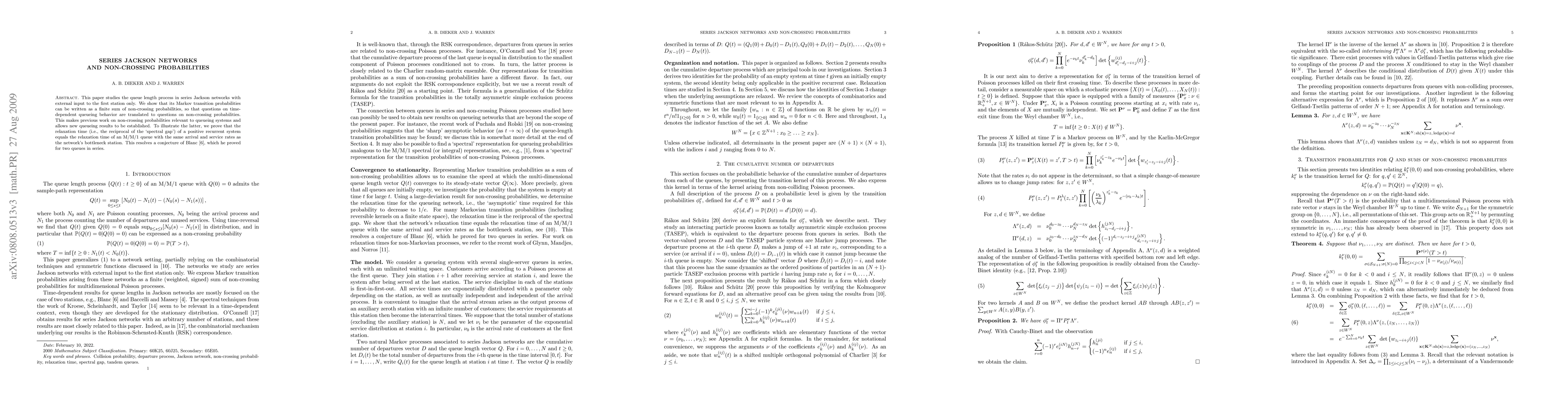 This paper connects series Jackson networks with external input to non-crossing probabilities, demonstrating that Markov transition probabilities in such networks can be expressed as a finite sum of these probabilities. It resolves a conjecture by showing that the relaxation time of a positive recurrent system equals that of an M/M/1 queue with the same rates as the bottleneck station.