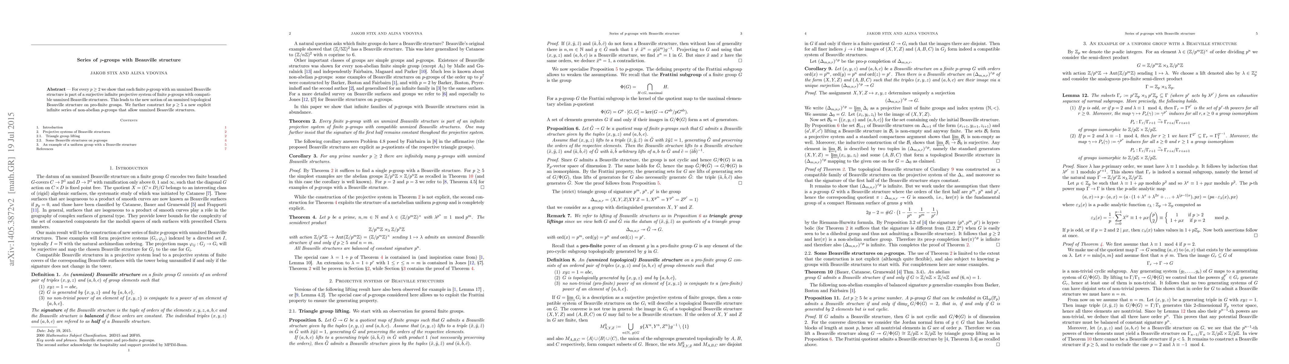 The paper demonstrates that every finite $p$-group with an unmixed Beauville structure fits into an infinite projective system, introducing the concept of an unmixed topological Beauville structure on pro-finite groups. Additionally, it constructs an explicit series of non-abelian $p$-groups for $p \geq 5$ with these structures.