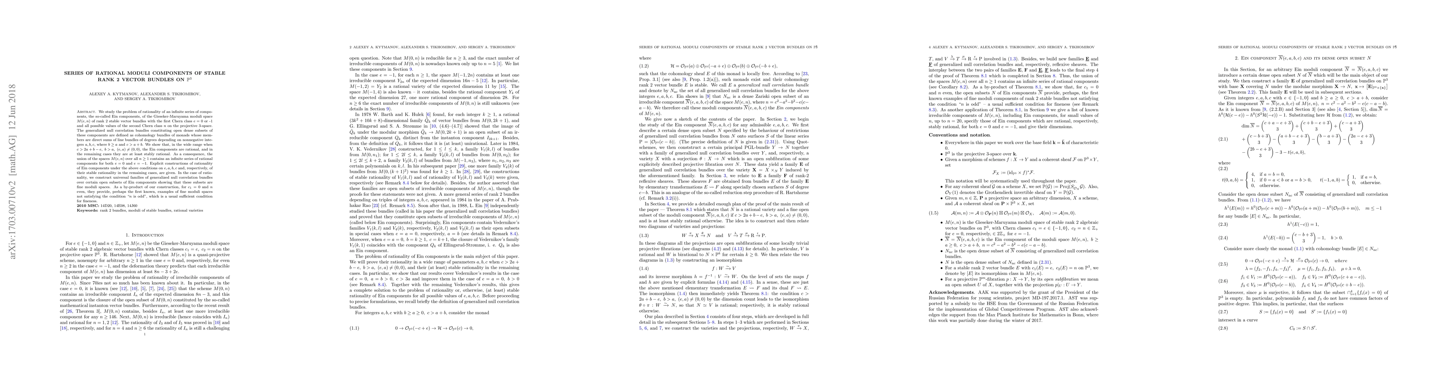 This paper investigates the rationality of certain moduli components in the Gieseker-Maruyama moduli space of rank 2 stable vector bundles on projective 3-space, showing that these components are rational under specific conditions and stably rational otherwise. It provides explicit constructions and universal families of these bundles over open subsets of the components.
