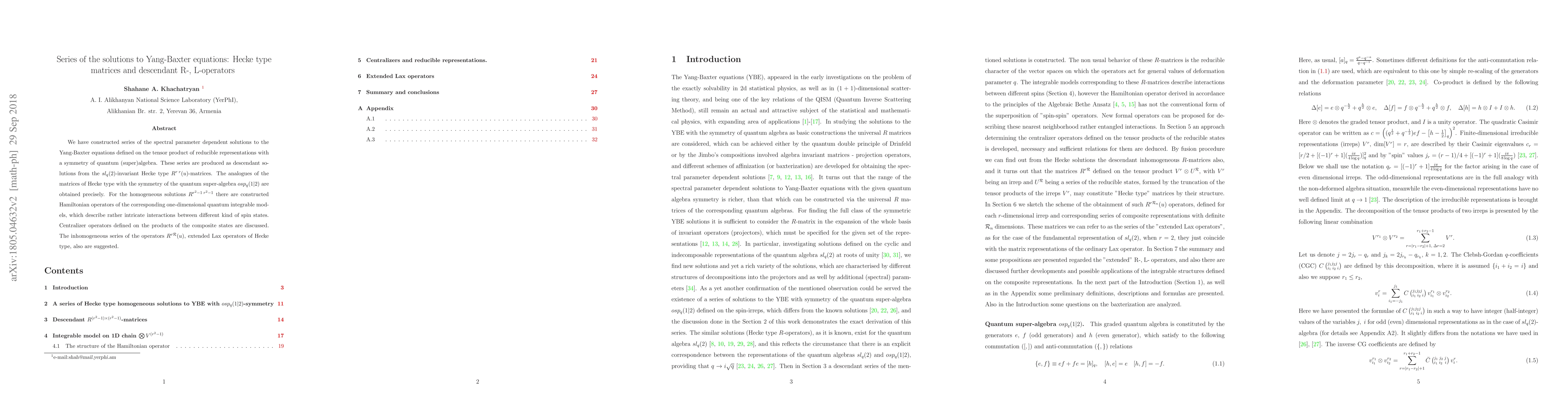This paper constructs spectral parameter dependent solutions to the Yang-Baxter equations using $sl_{q}(2)$-invariant Hecke type matrices, and extends these to quantum super-algebra $osp_q(1|2)$. It also introduces Hamiltonian operators for one-dimensional quantum integrable models and discusses centralizer operators on composite states.