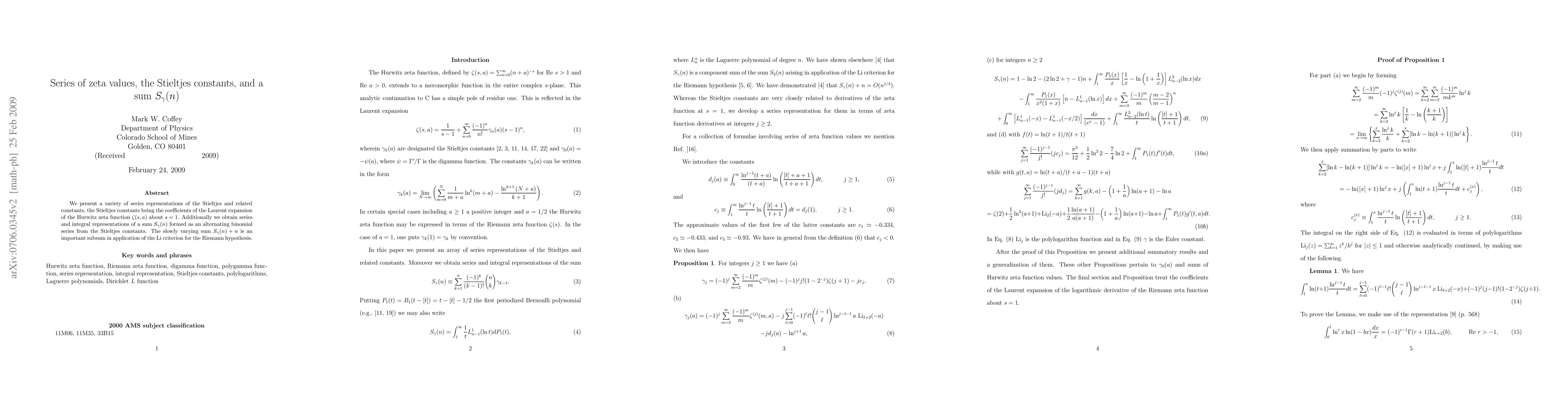 This paper provides series representations of the Stieltjes constants and introduces an alternating binomial series sum S_\gamma(n) derived from these constants. The sum S_\gamma(n)+n is significant in the context of the Li criterion for the Riemann hypothesis.