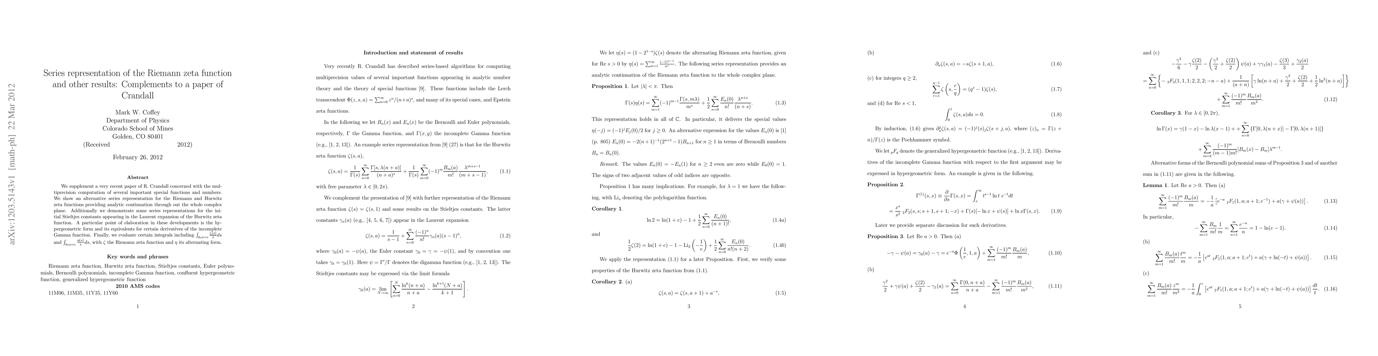 We supplement a very recent paper of R. Crandall concerned with the multiprecision computation of several important special functions and numbers. We show an alternative series representation for the Riemann and Hurwitz zeta functions providing analytic continuation through out the whole complex plane. Additionally we demonstrate some series representations for the initial Stieltjes constants appearing in the Laurent expansion of the Hurwitz zeta function. A particular point of elaboration in these developments is the hypergeometric form and its equivalents for certain derivatives of the incomplete Gamma function. Finally, we evaluate certain integrals including $\int_{\tiny{Re} s=c} {{\zeta(s)} \over s} ds$ and $\int_{\tiny{Re} s=c} {{\eta(s)} \over s} ds$, with $\zeta$ the Riemann zeta function and $\eta$ its alternating form.
