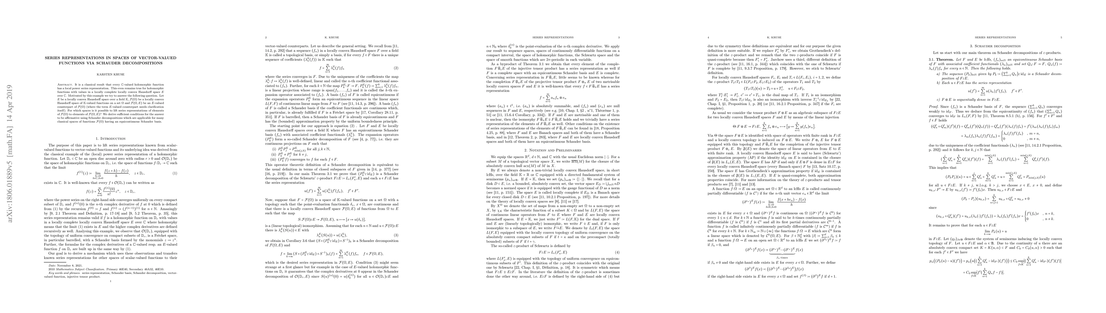 This paper explores the conditions under which series representations of vector-valued functions in locally convex spaces can be extended from scalar-valued to vector-valued function spaces using Schauder decompositions. It provides a framework for lifting local power series representations to vector-valued counterparts.