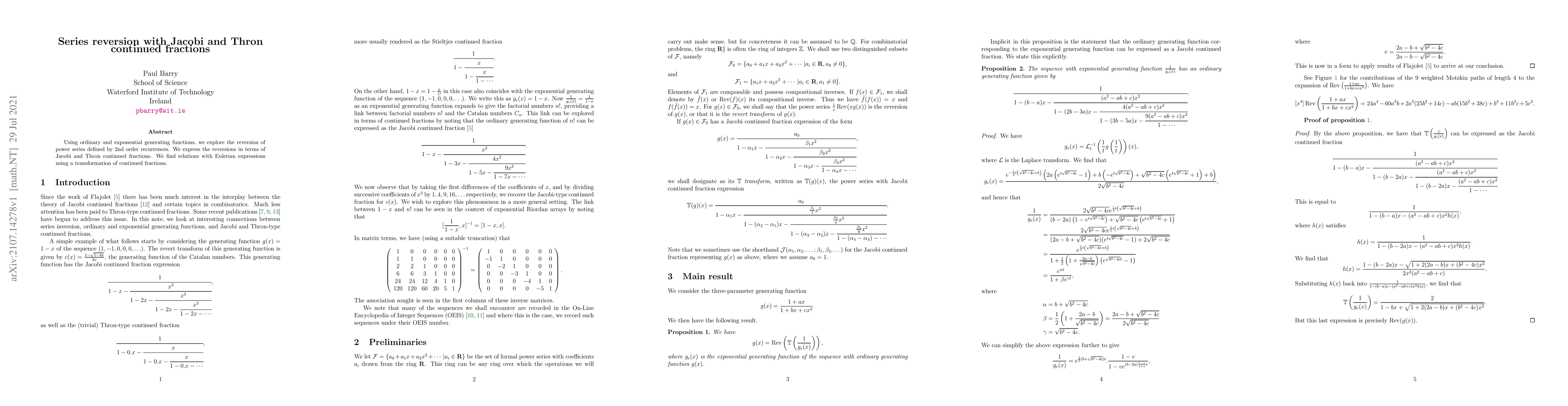 The paper explores series reversion using ordinary and exponential generating functions, expressing reversions in terms of Jacobi and Thron continued fractions. It also establishes relations with Eulerian expressions through a transformation of continued fractions.