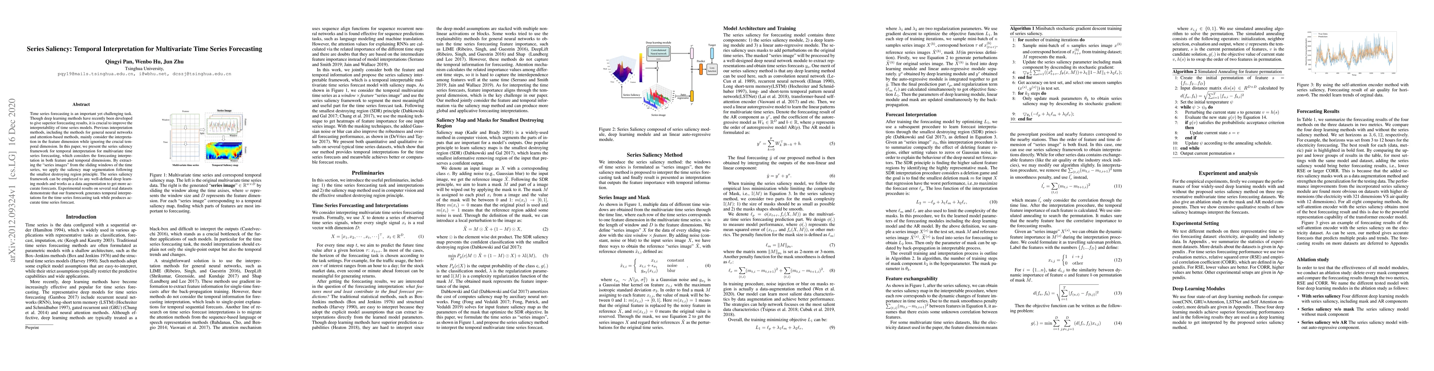 This paper introduces the series saliency framework to enhance interpretability in multivariate time series forecasting by considering both feature and temporal dimensions. It uses "series images" and saliency map segmentation to provide accurate temporal interpretations, improving the accuracy of deep learning models for forecasting.