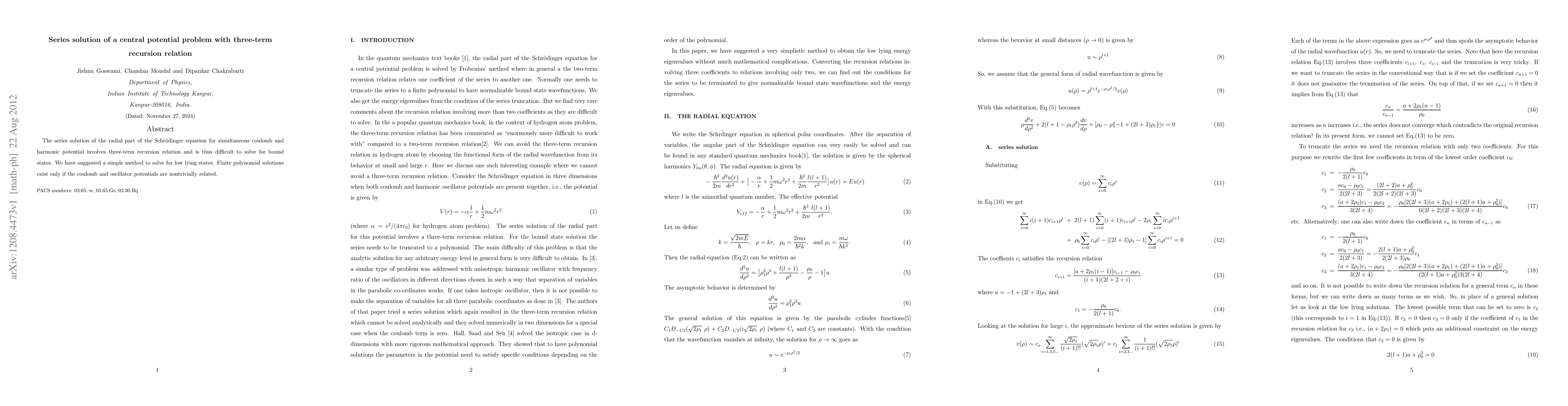The series solution of the radial part of the Schr\"odinger equation for simultaneous coulomb and harmonic potential involves three-term recursion relation and is thus difficult to solve for bound states. We have suggested a simple method to solve for low lying states. Finite polynomial solutions exist only if the coulomb and oscillator potentials are nontrivially related.