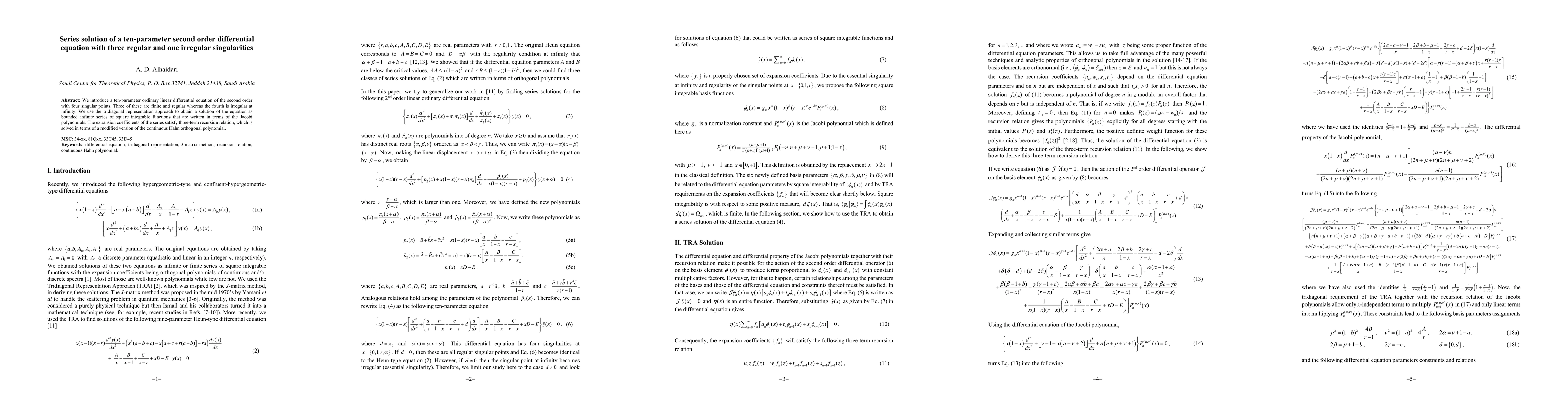 This paper presents a solution to a 10-parameter differential equation with 3 regular and 1 irregular singularity, using the tridiagonal representation approach and Jacobi polynomials.